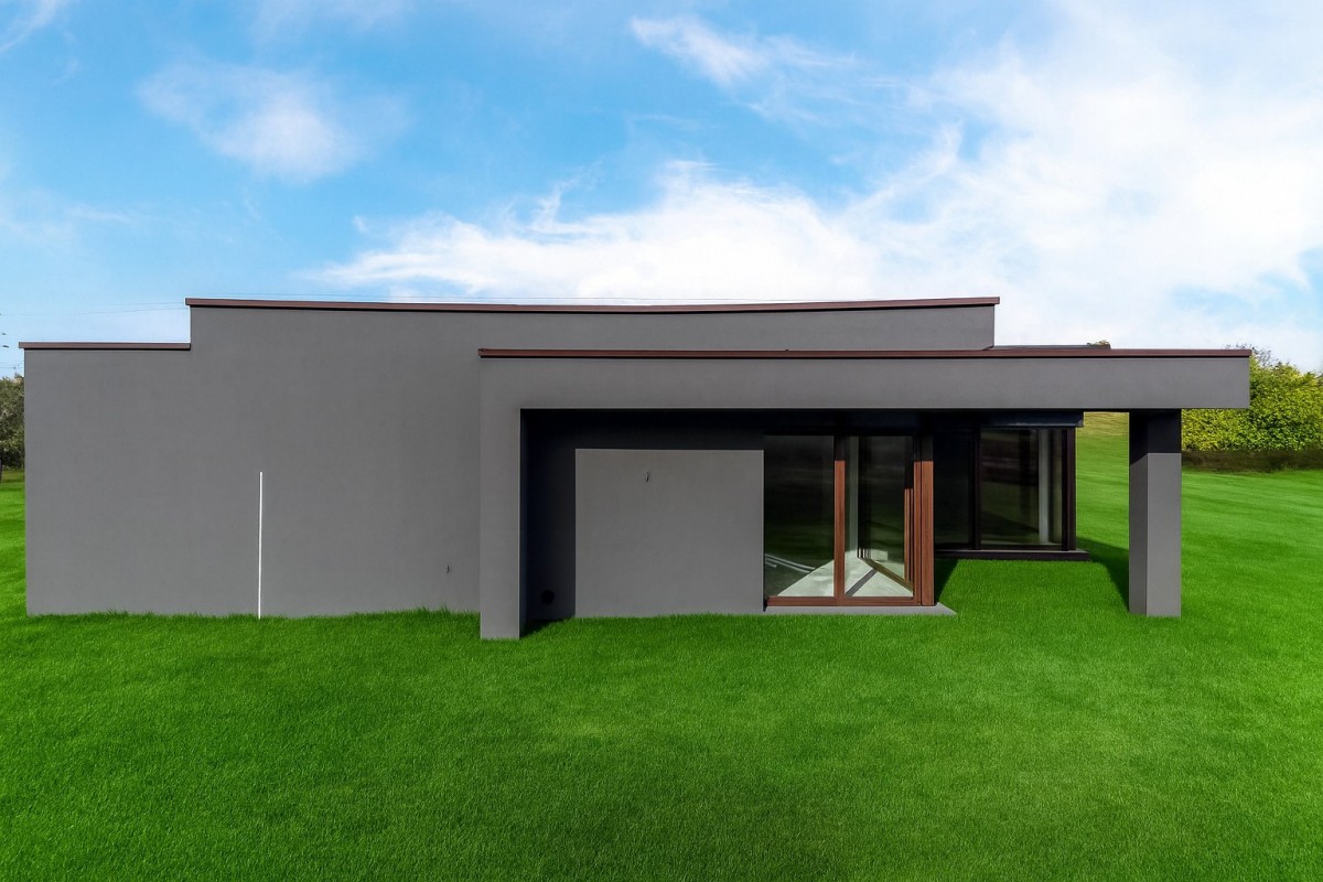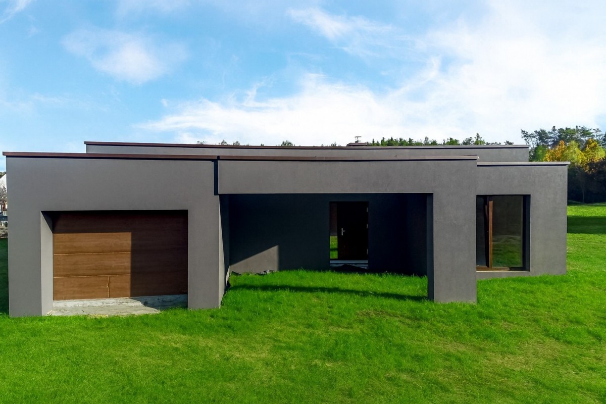 – Minimalistyczna bryła, płaski dach, grafitowa elewacja