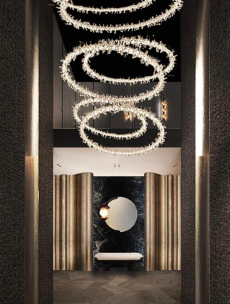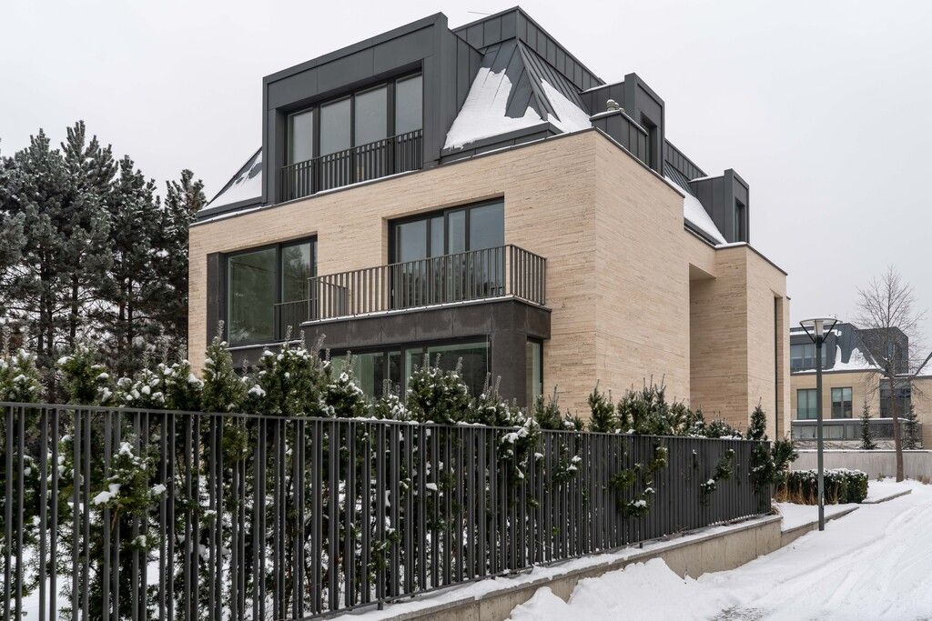 Nowoczesna bryła budynku przyciąga uwagę elegancką elewacją z trawertynu oraz dużymi przeszkleniami, które nadają całości ponadczasowy, luksusowy charakter.