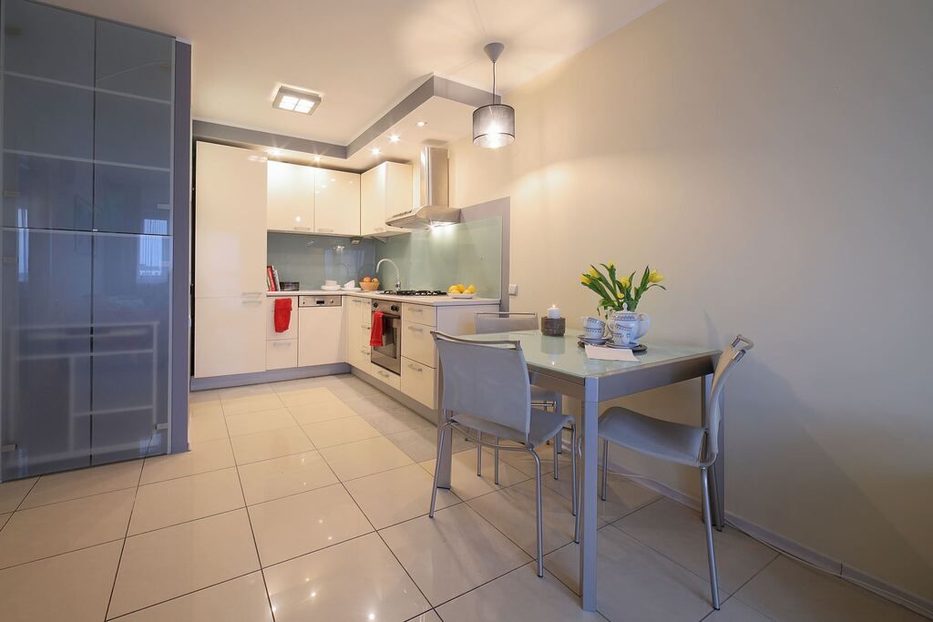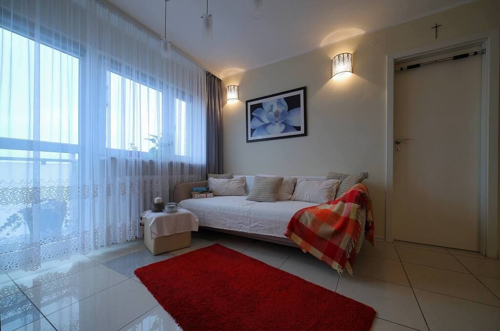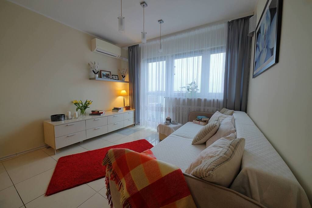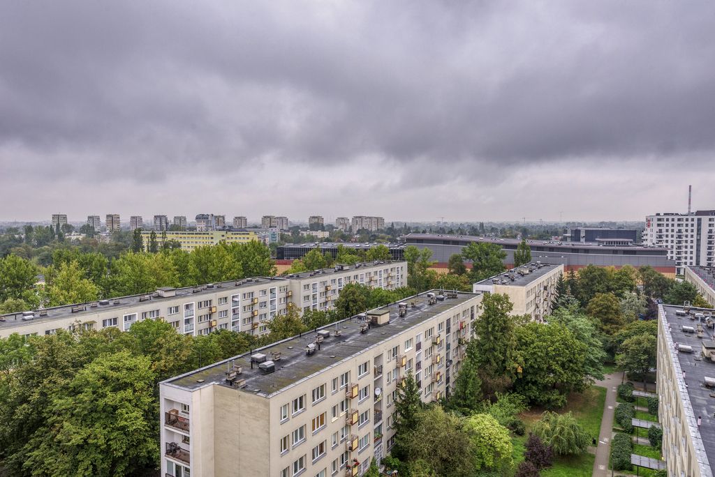 Apartament mieści się na 10 piętrze z pięknym widokiem na rozległą panoramę Warszawy.