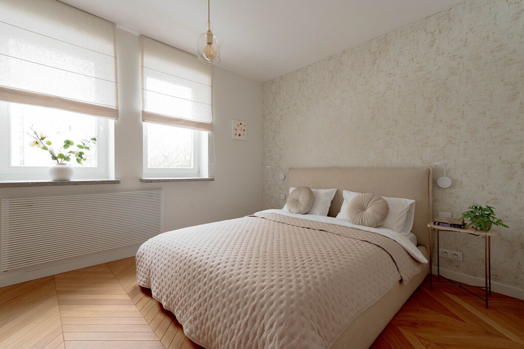 Strefa prywatna obejmuje przestrzeń na garderobę oraz sypialnię. Wnętrze wykończone zostało z najwyższej jakości materiałów – nowe dębowe podłogi, designerskie grzejniki, klimatyzacja oraz drewniane, trzyszybowe okna.