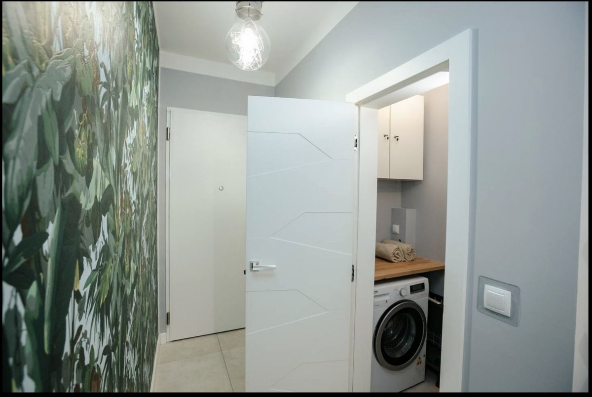 Pomieszczenia gospodarczego z pralką i miejscem na przechowywanie rzeczy.