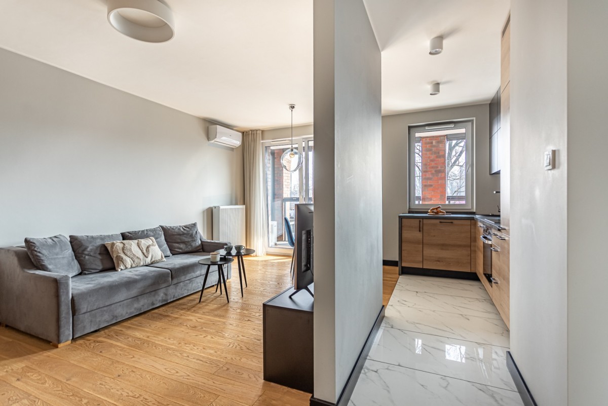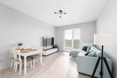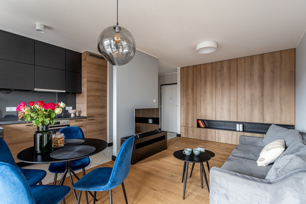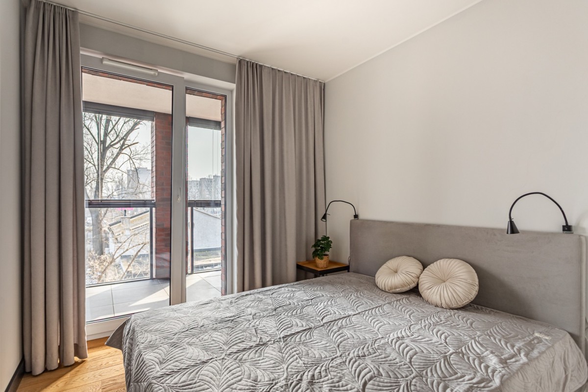 Nowoczesny, komfortowy dwupokojowy apartament na sprzedaż na drugim piętrze kameralnej inwestycji. Nieruchomość wyróżnia się panoramicznymi oknami, które zapewniają doskonałe doświetlenie wnętrz, oraz przestronnym balkonem o powierzchni 12.45 m², dostępnym zarówno z salonu, jak i sypialni. Jest w pełni wyposażony w meble oraz sprzęty RTV i AGD, co pozwala na natychmiastowe zamieszkanie bez dodatkowych nakładów.