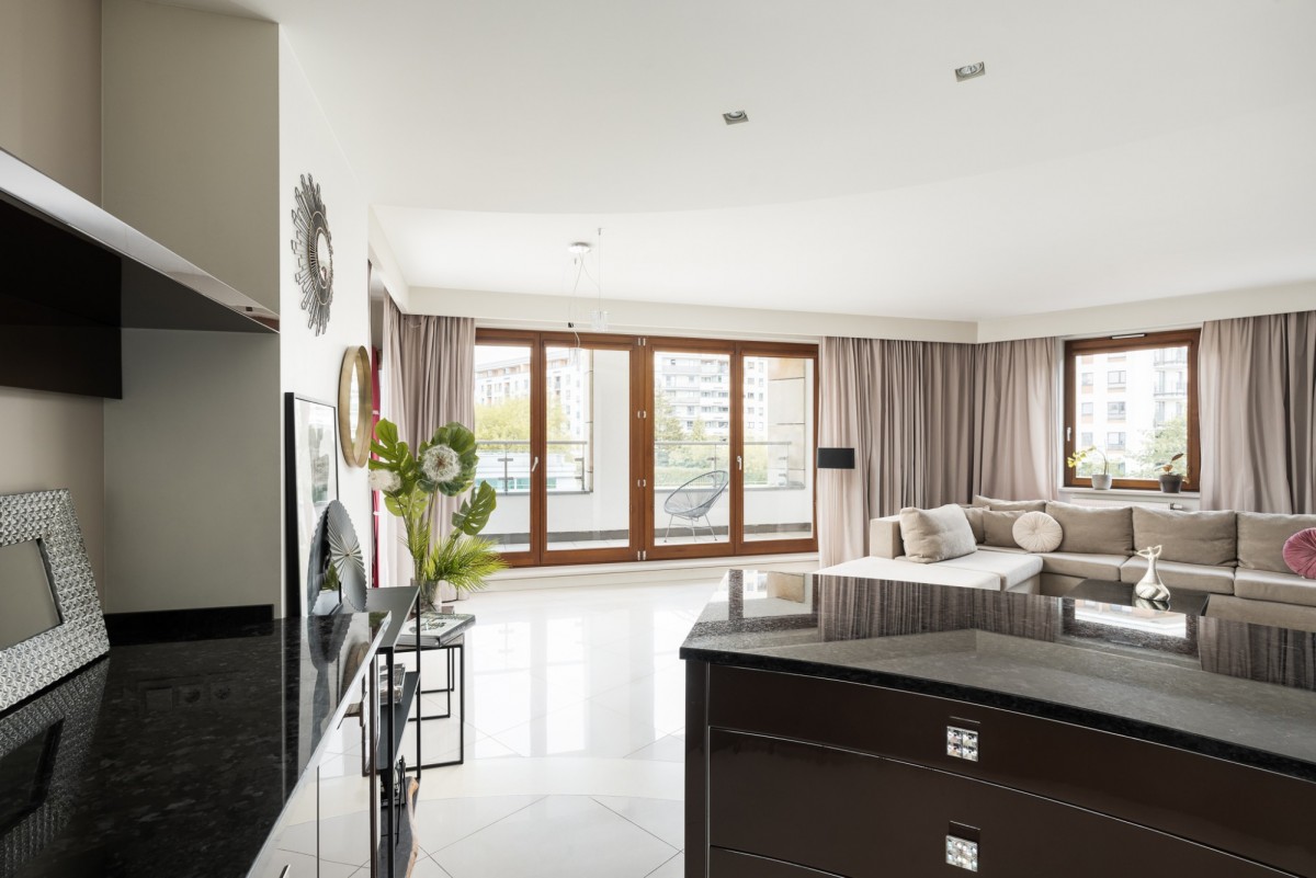 Drewniano-aluminiowe okna luksusowej marki Goran urzekają wysoką jakością, pięknem i formą, a jednocześnie zapewniają wysoką energooszczędność. Przedłużeniem mieszkania jest przestronny taras, na który można wyjść z dwóch stron, co stanowi idealne miejsce do relaksu.