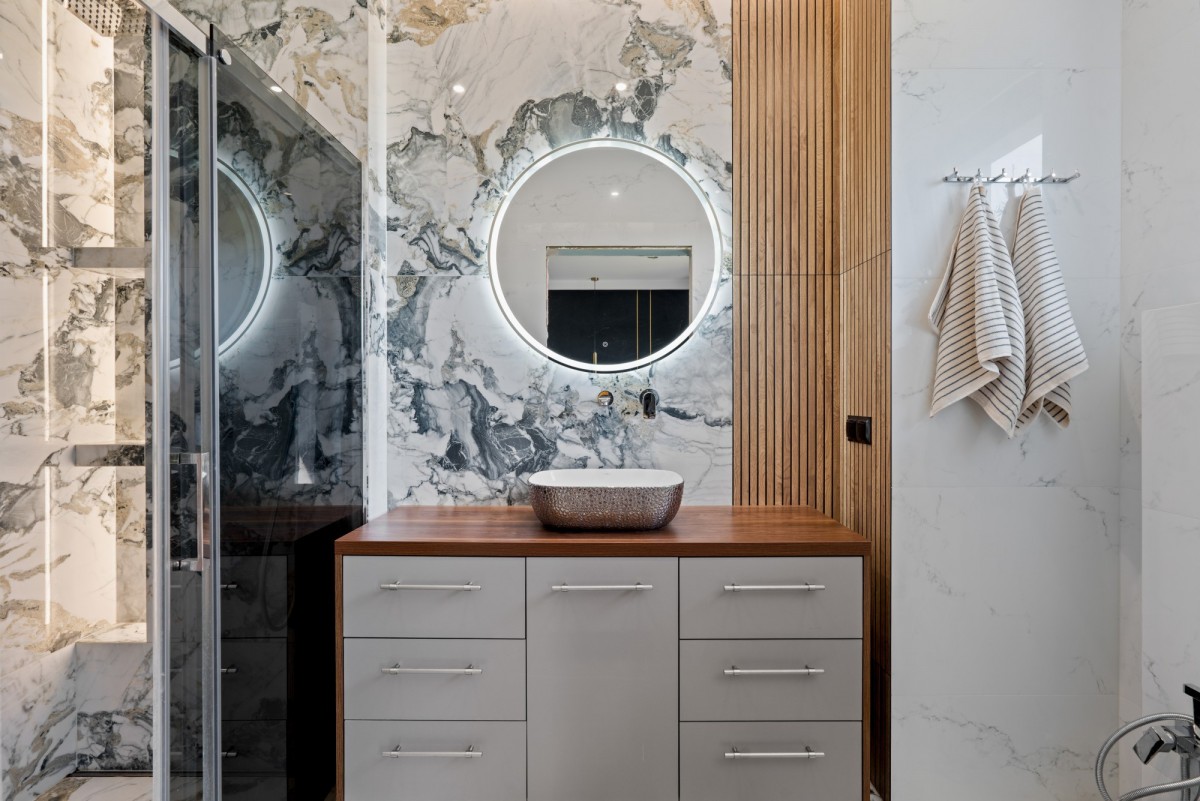 Dom został zaprojektowany z ogromną dbałością o szczegóły i wykończony materiałami najwyższej klasy. W całym budynku zastosowano ogrzewanie podłogowe (także w garażu), rekuperację, a także przygotowano instalacje pod klimatyzację i fotowoltaikę. Dla bezpieczeństwa dom wyposażony jest w nowoczesne systemy alarmowe – zarówno zewnętrzne, jak i wewnętrzne.