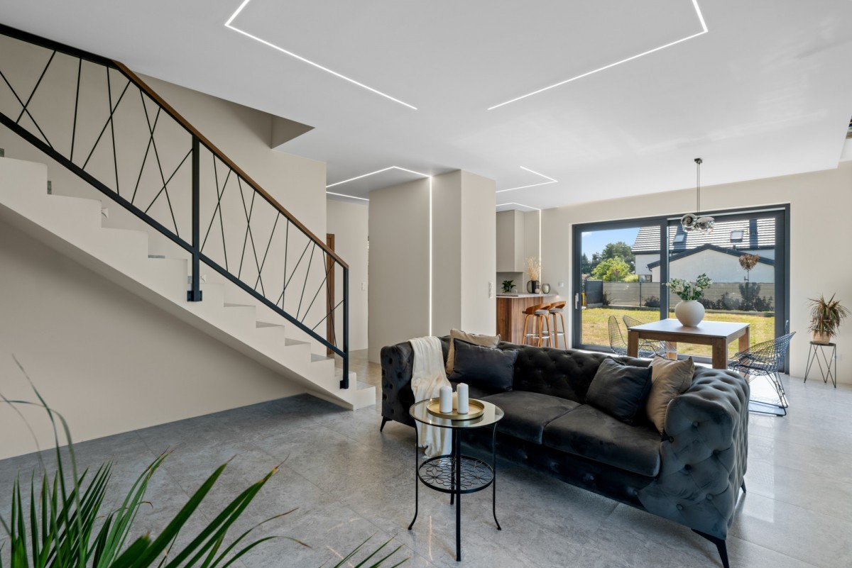 Dom został zaprojektowany z ogromną dbałością o szczegóły i wykończony materiałami najwyższej klasy. W całym budynku zastosowano ogrzewanie podłogowe (także w garażu), rekuperację, a także przygotowano instalacje pod klimatyzację i fotowoltaikę. Dla bezpieczeństwa dom wyposażony jest w nowoczesne systemy alarmowe – zarówno zewnętrzne, jak i wewnętrzne.