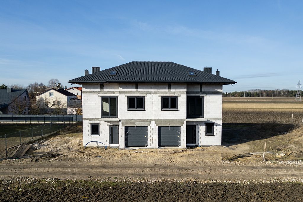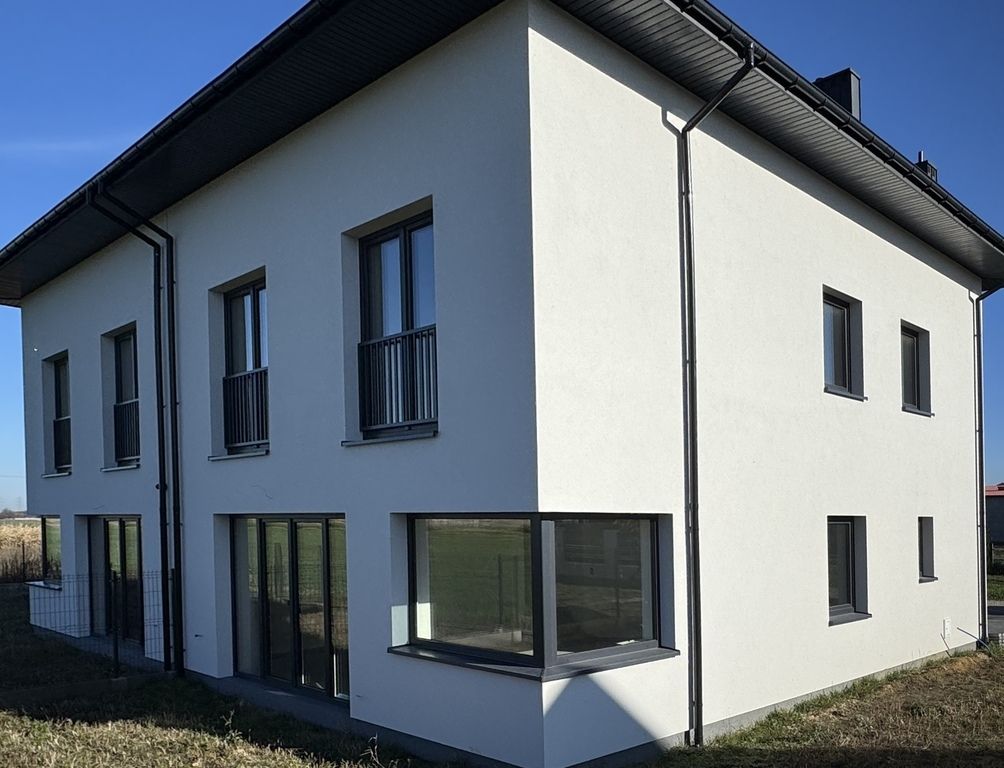 Modern semi-detached house with a large garden (200 m²), finished in bright, pleasant tones. Functional layout with a garage integrated into the building structure.