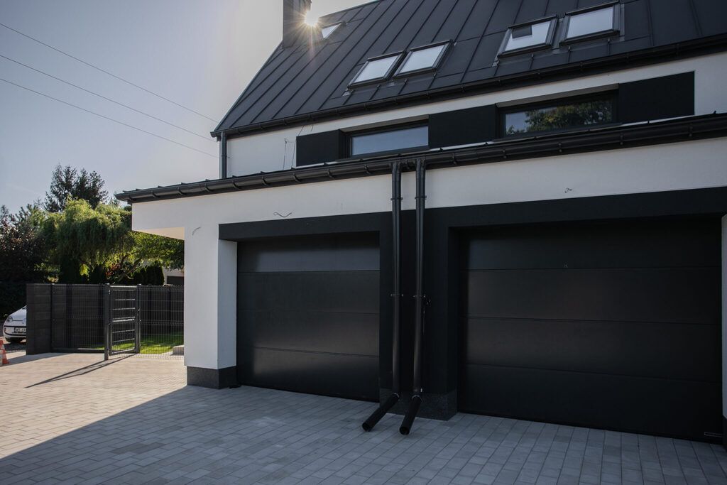 Budynek zachwyca formą nowoczesnej stodoły, a wyjątkowego charakteru nadają mu stylowe wykusze garaży oraz wnęki wejściowe, ukryte pod efektownym frontowym podcieniem.