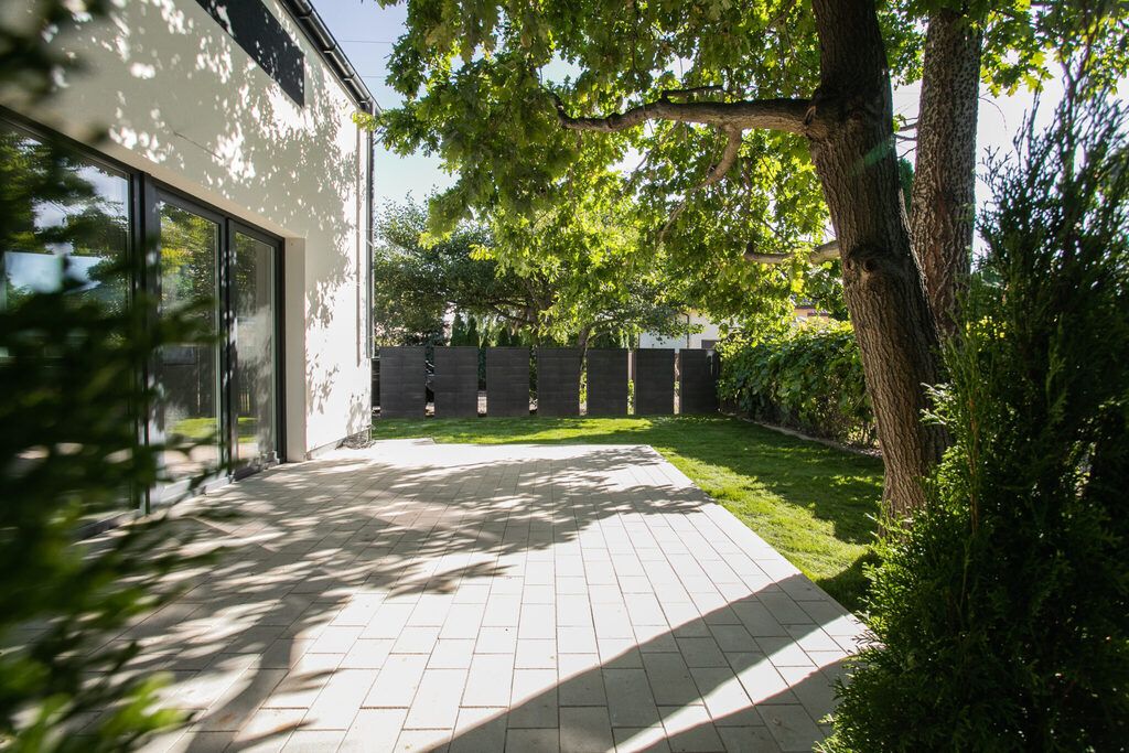 – duży, utwardzony taras, który stanowi naturalne przedłużenie salonu w stronę ogrodu,