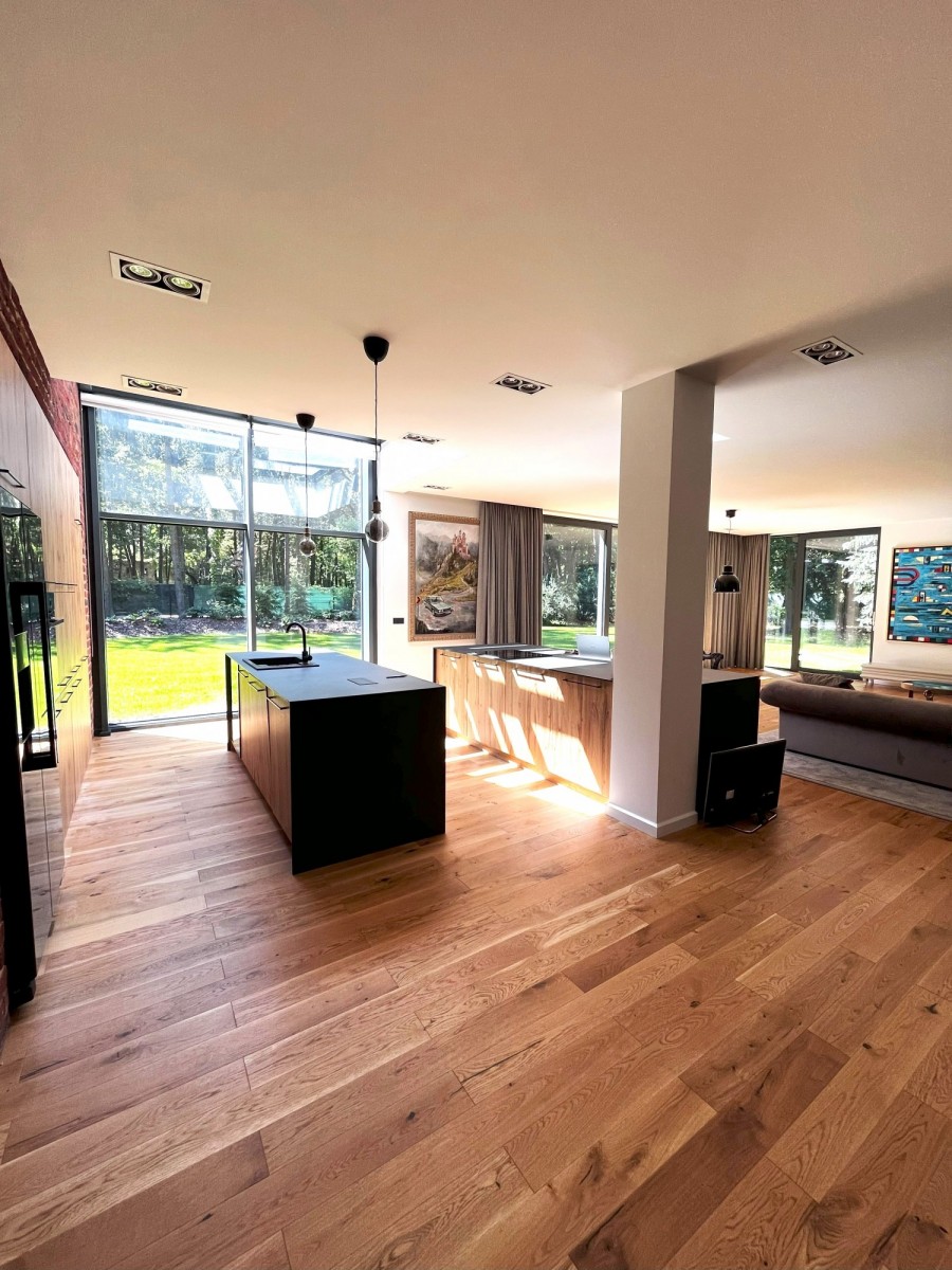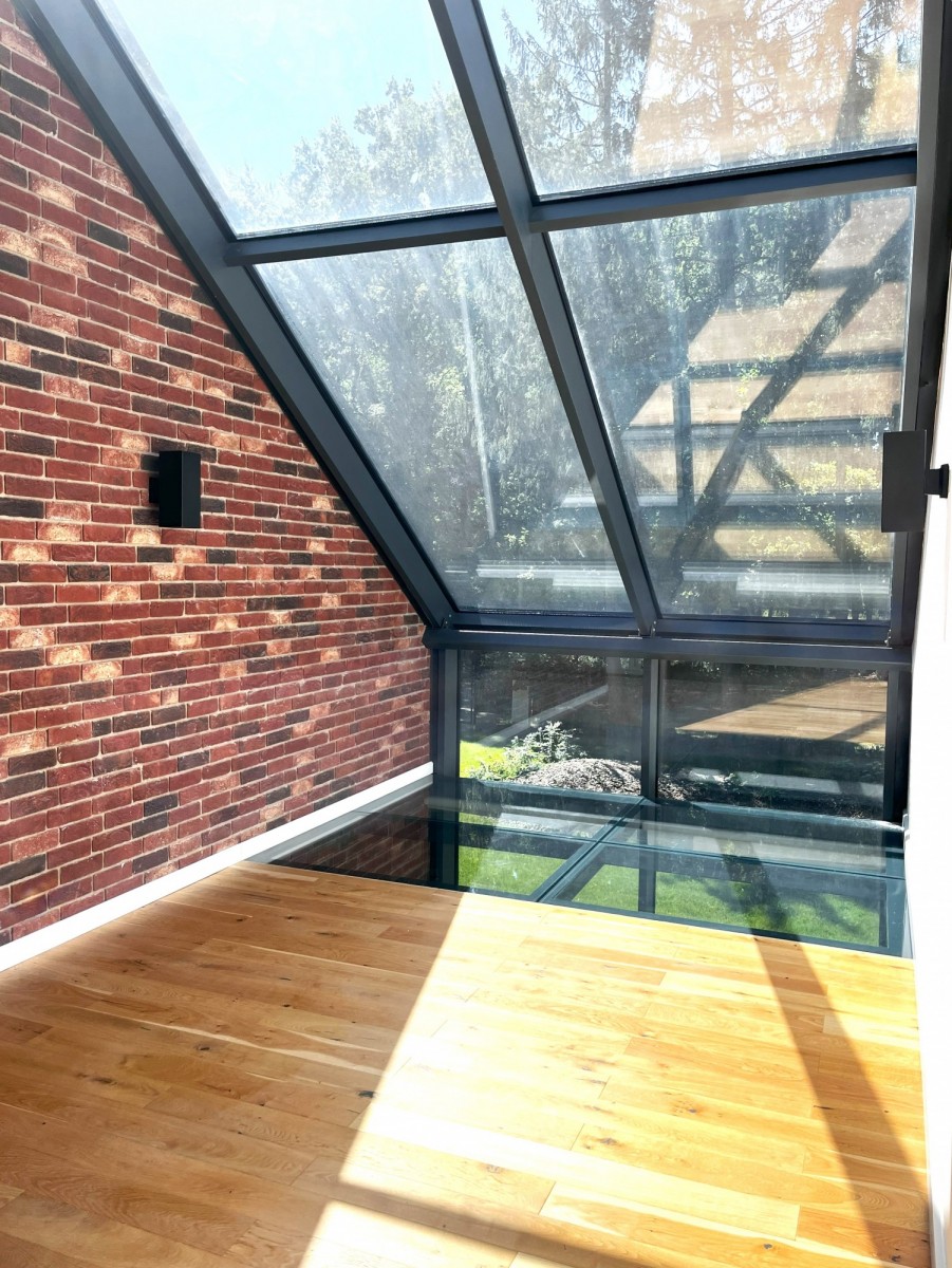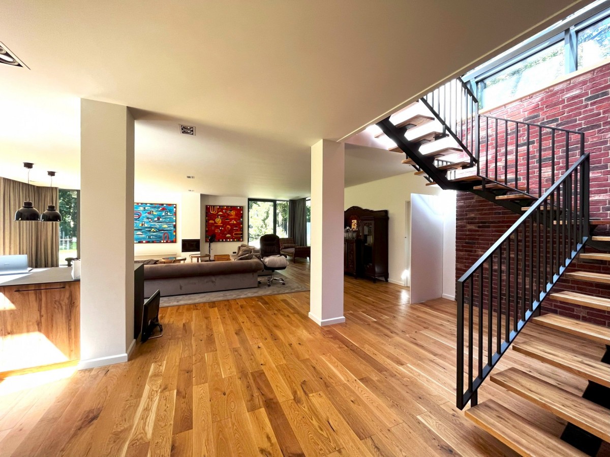 Panoramiczne przeszklenia płynnie łączą wnętrza z ogrodem, wpuszczając naturalne światło przez cały dzień i tworząc poczucie harmonii oraz spokoju. Strefa dzienna na parterze została zaprojektowana jako otwarta, wygodna przestrzeń do życia i spotkań: