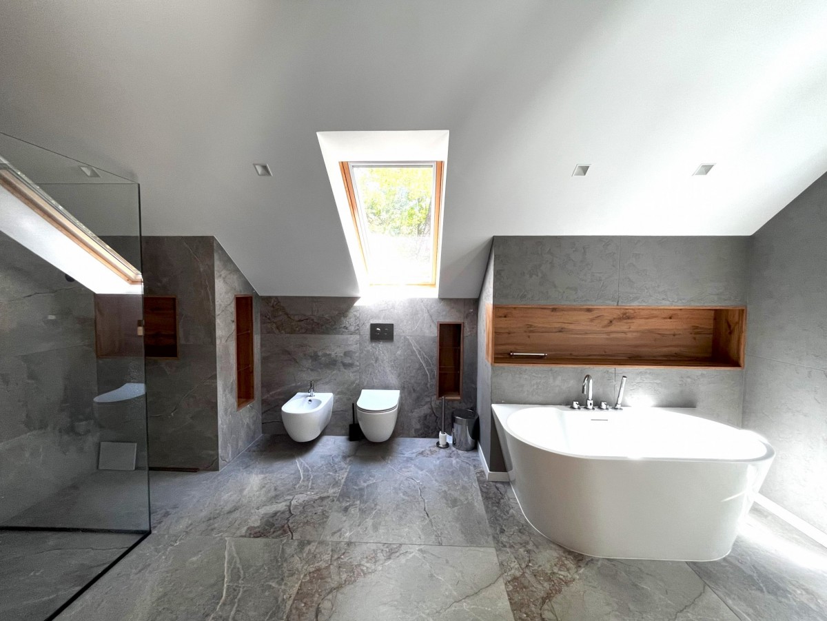 sypialnia master z prywatną łazienką (wanna i prysznic) oraz garderobą
