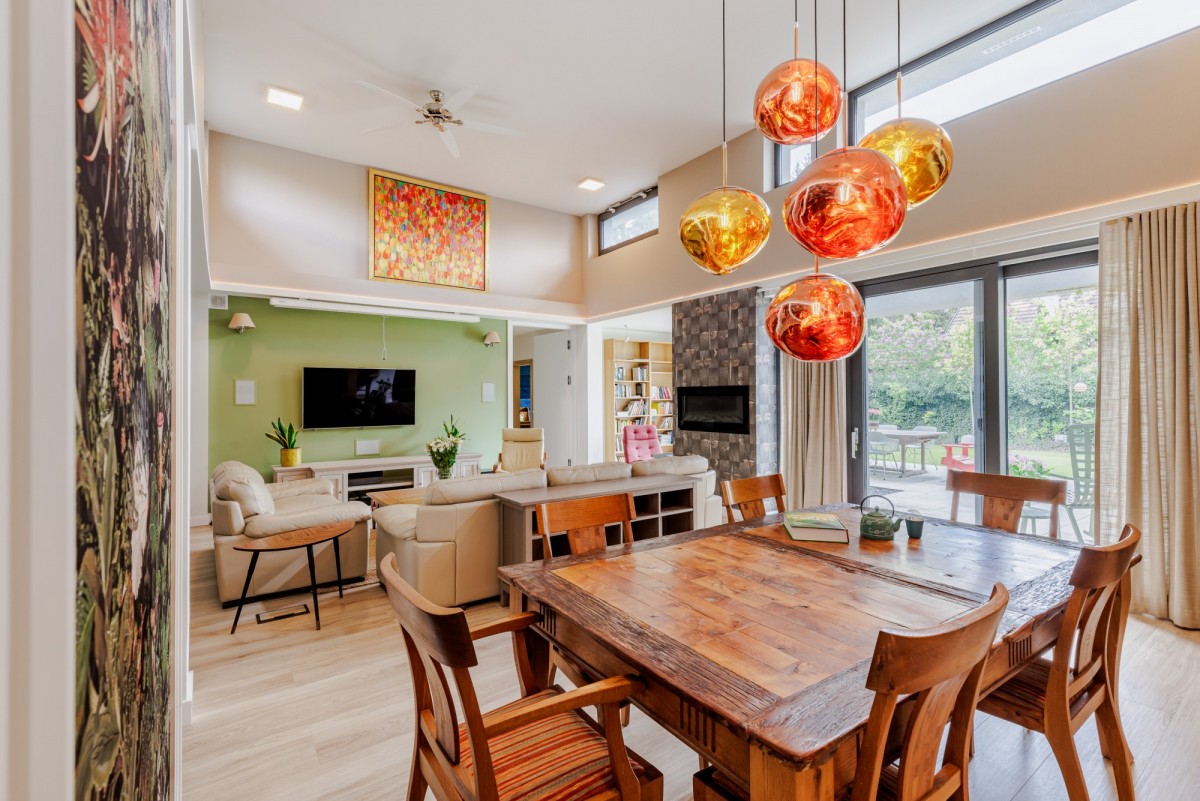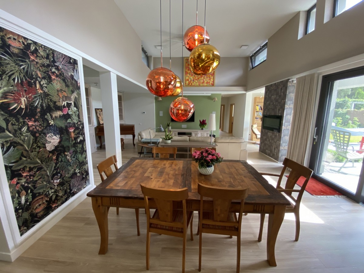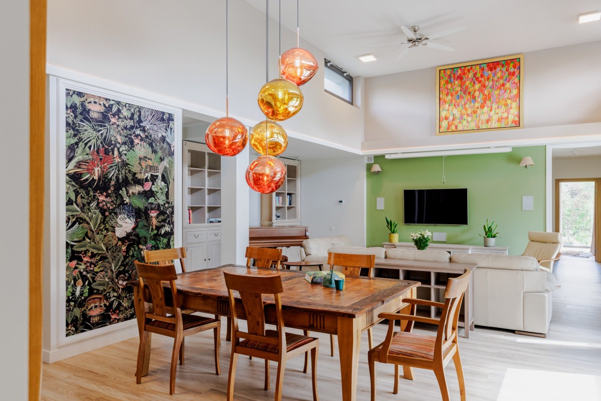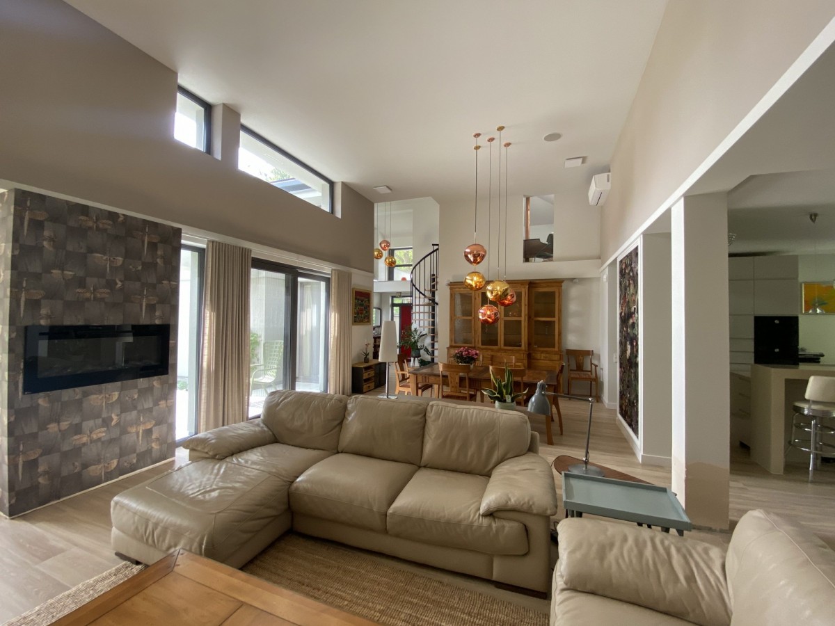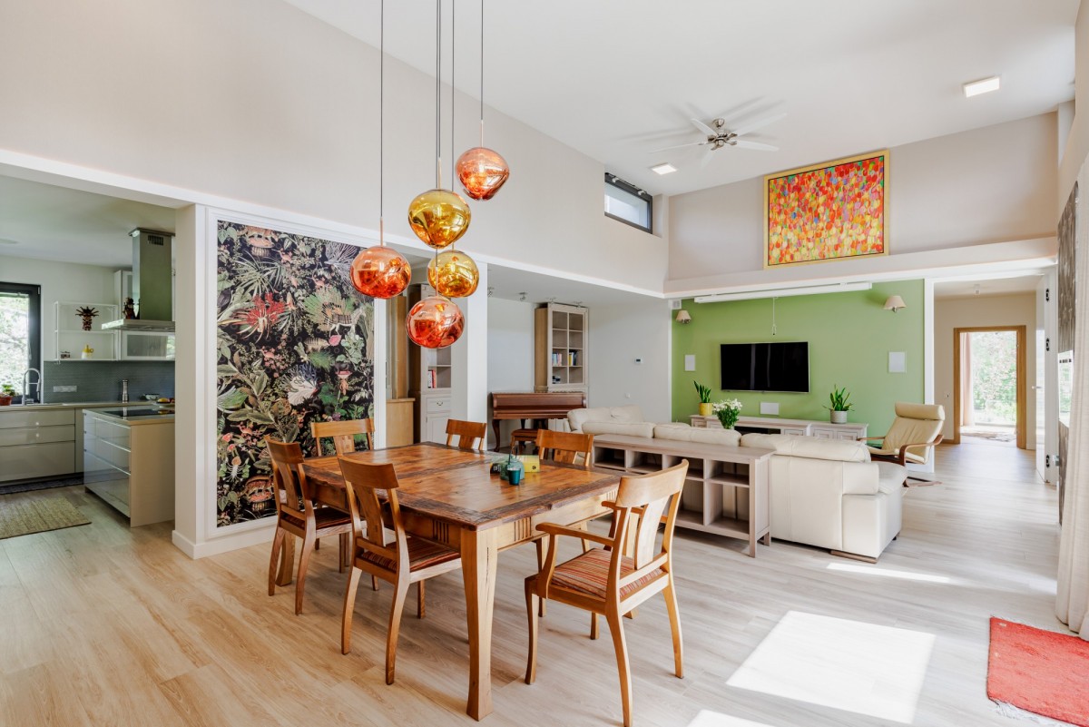 The central part of the house features a living room with a dining area (60m2) and a semi-open kitchen (23m2) and a pantry (4m2), with a ceiling height of 5 meters, creating a bright and airy heart of the home.