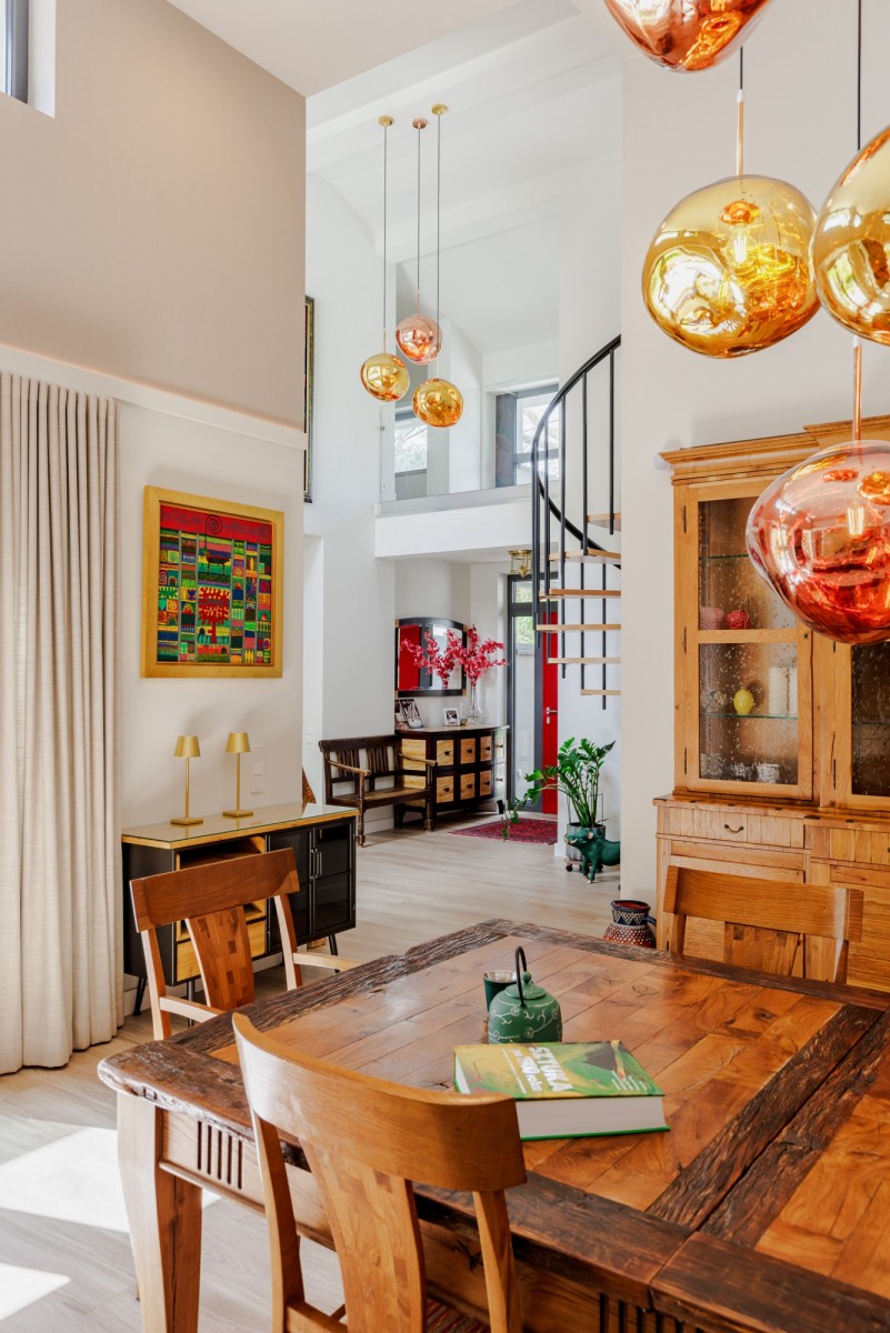 – W centralnej części znajduje się wysoki na 5 metrów salon z jadalnią (60m2) oraz pół-otwartą kuchnią (23m2) ze spiżarnią (4m2), stanowiące serce domu i miejsce spotkań domowników.