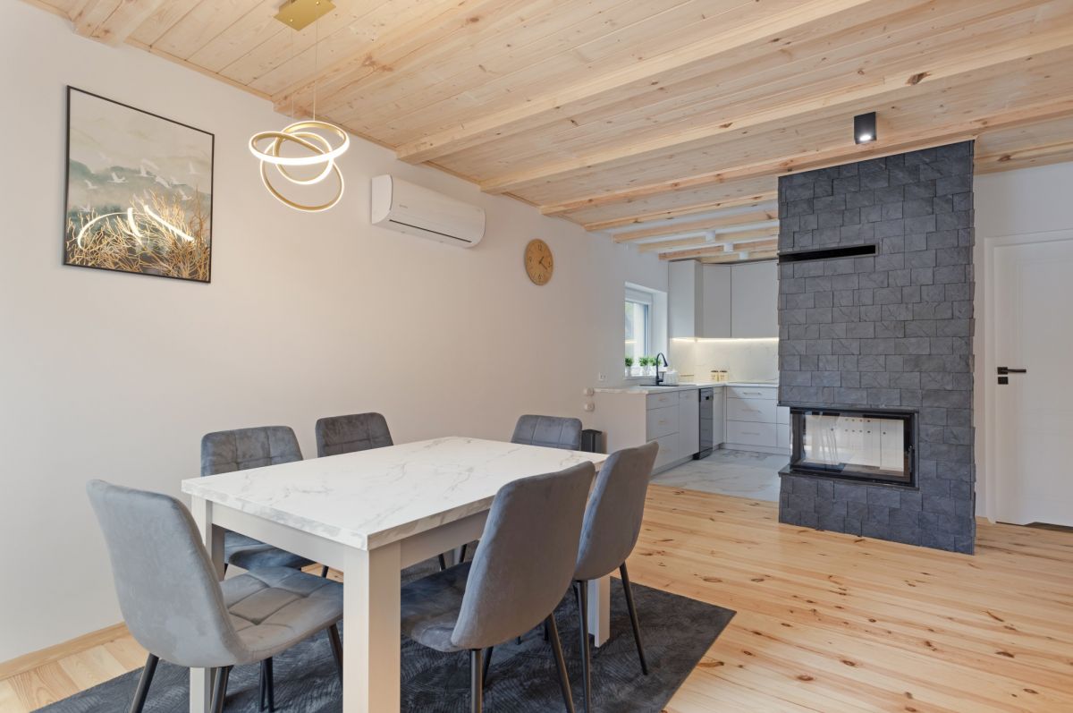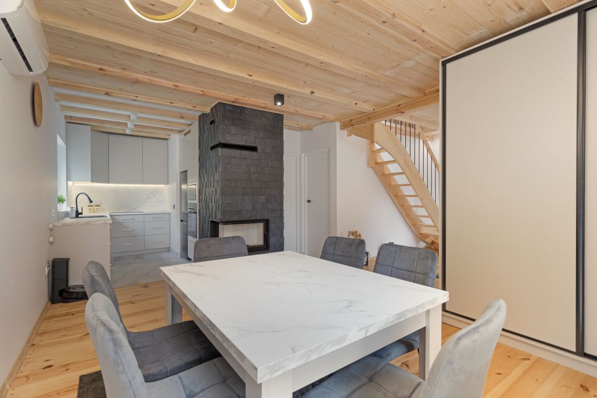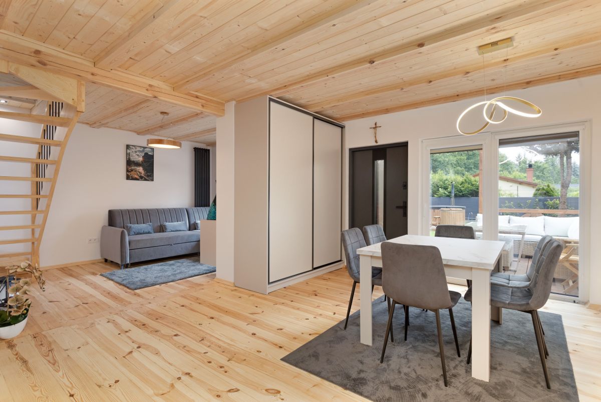 - Przestronny salon połączony z kuchnią i jadalnią z dużym stołem