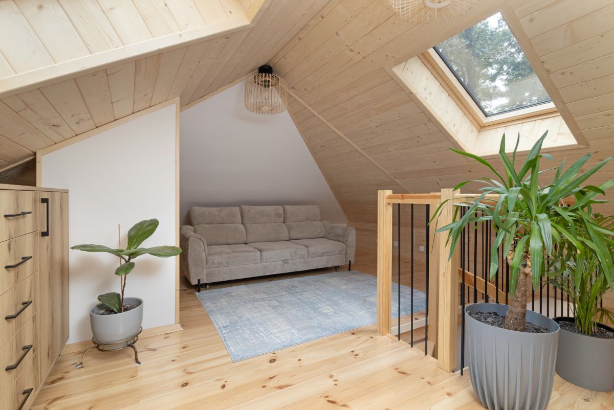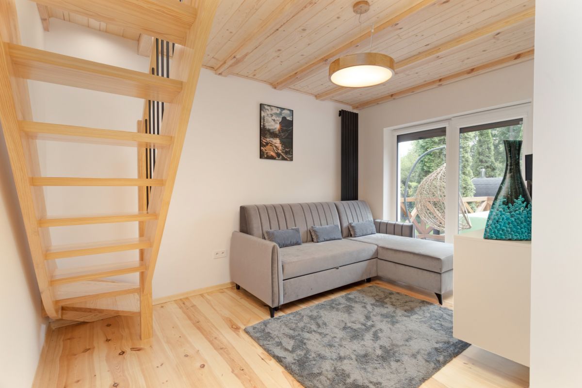 - Przestronna strefa wypoczynkowa zaaranżowana na dodatkowy pokój z wygodna kanapą i telewizorem