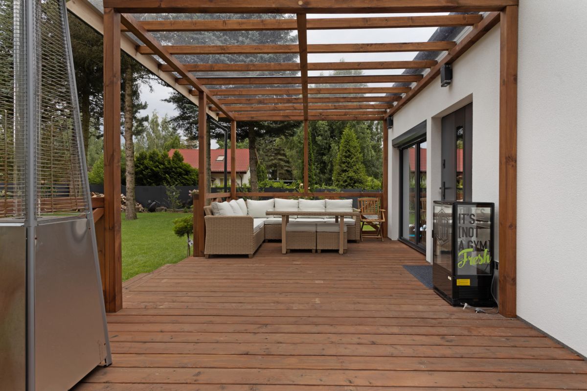 O powierzchni 26 m2 i wymiarach 360 cm x 730 cm, zadaszony dachem poliwęglanowym.
