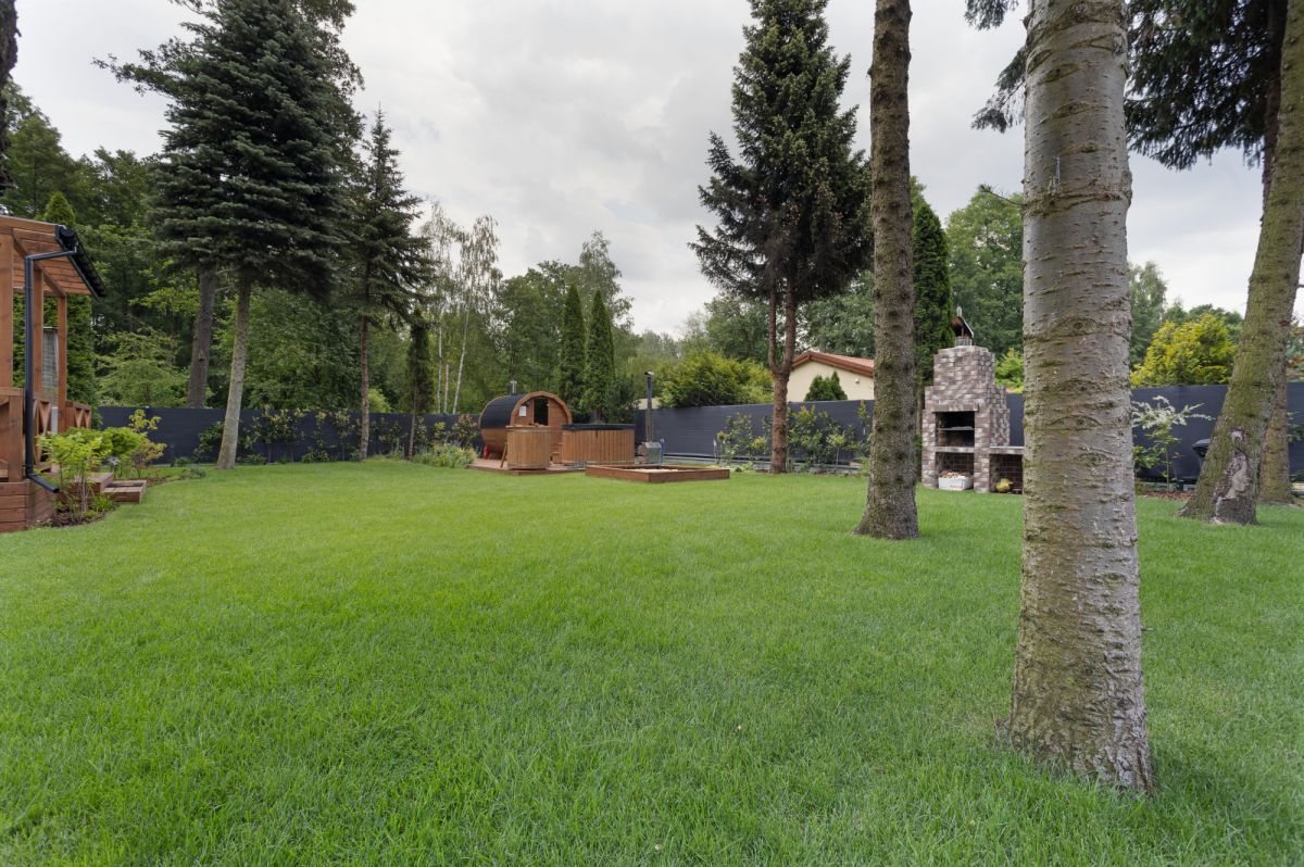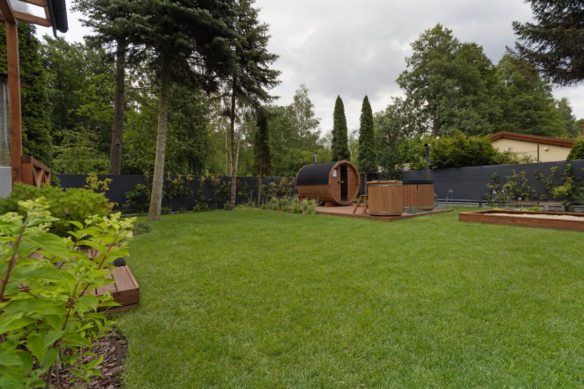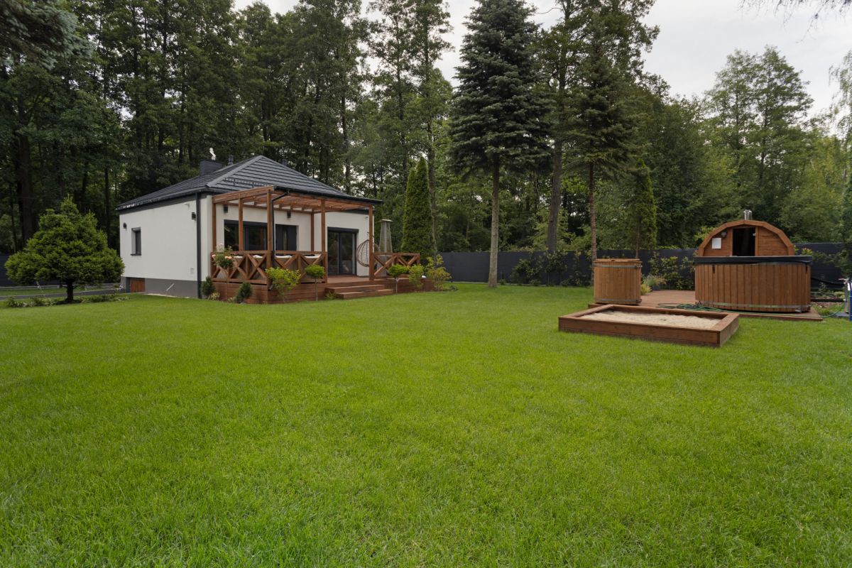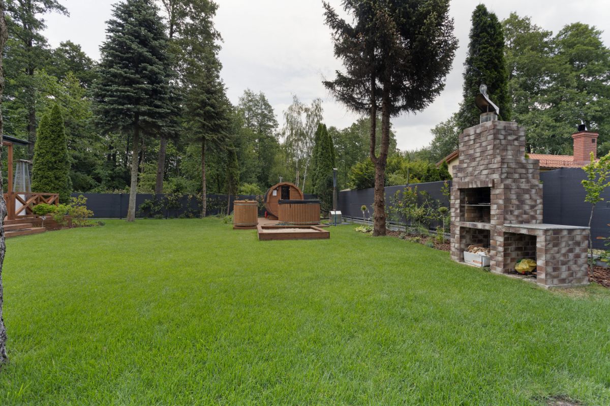 Dom urządzony jest w nowoczesnym stylu, łącząc elegancję z funkcjonalnością. W ogrodzie znajdują się sauna i balia, miejsce do grillowania, taras z meblami wypoczynkowymi oraz plac zabaw dla dzieci. Ogród obsługiwany jest przez system nawadniania komputerowego, a bezpieczeństwo zapewniają brama automatyczna i system kamer. Dodatkowo zastosowano rolety antywłamaniowe i poliwęglanowe zadaszenia, co podnosi komfort i funkcjonalność całej nieruchomości.