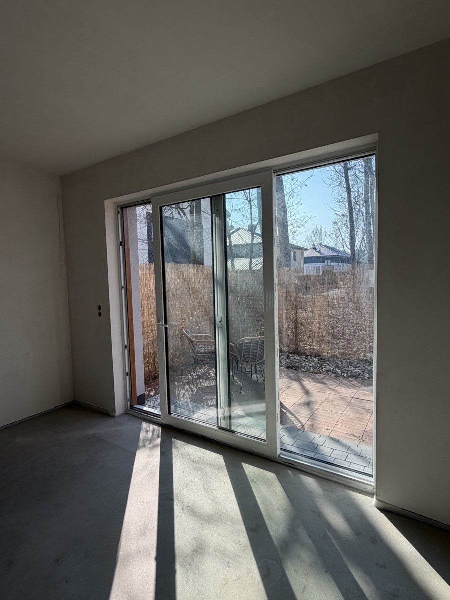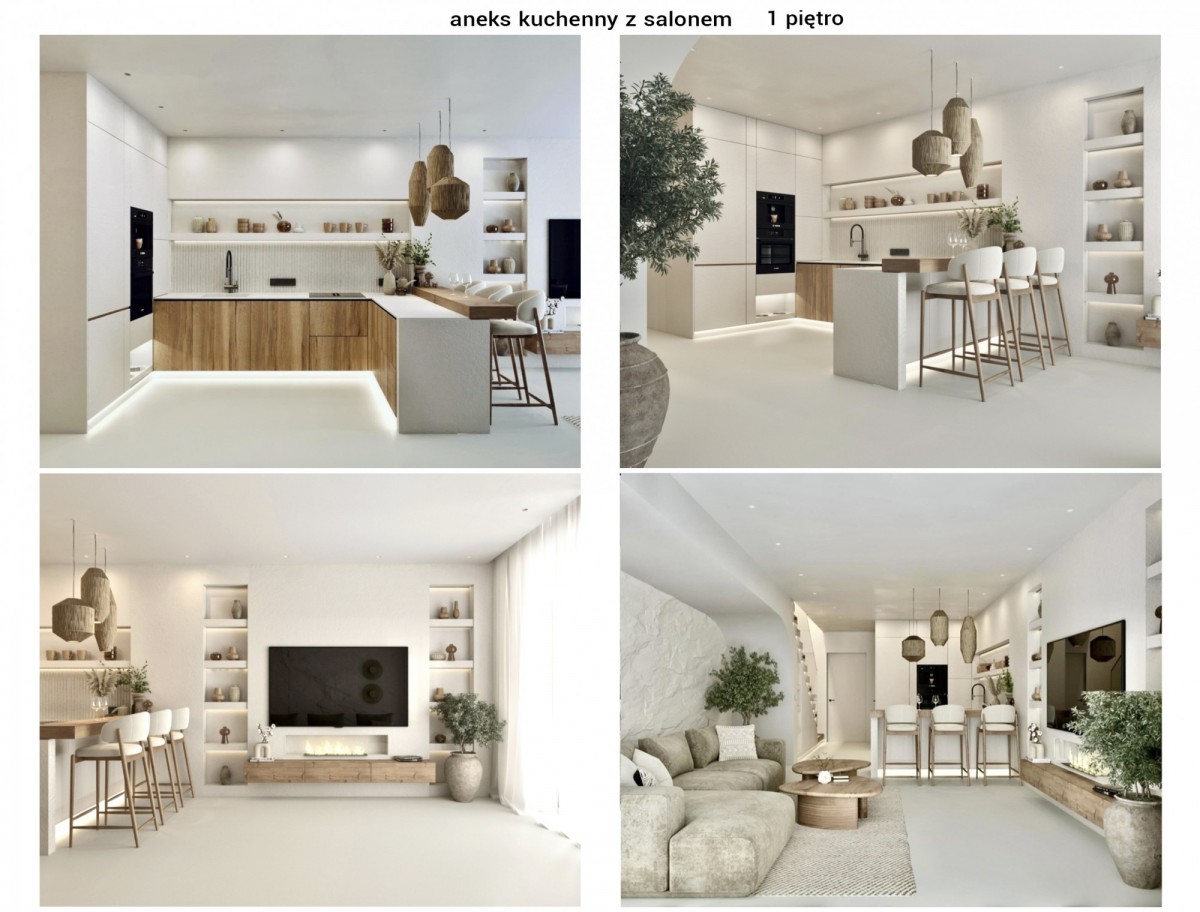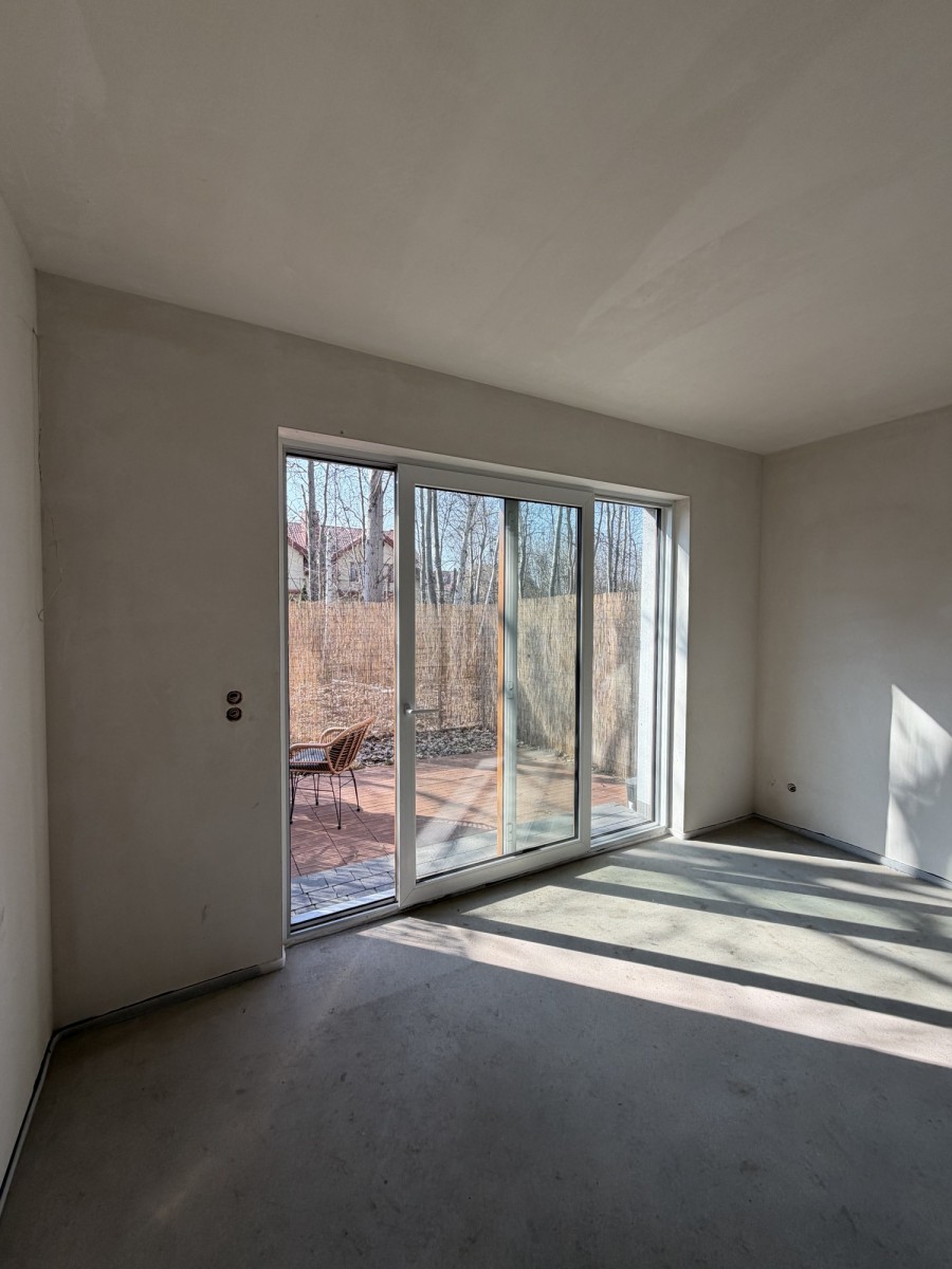 Słoneczny salon z aneksem kuchennym (30,4 m²) i wyjściem do ogródka (46 m²).