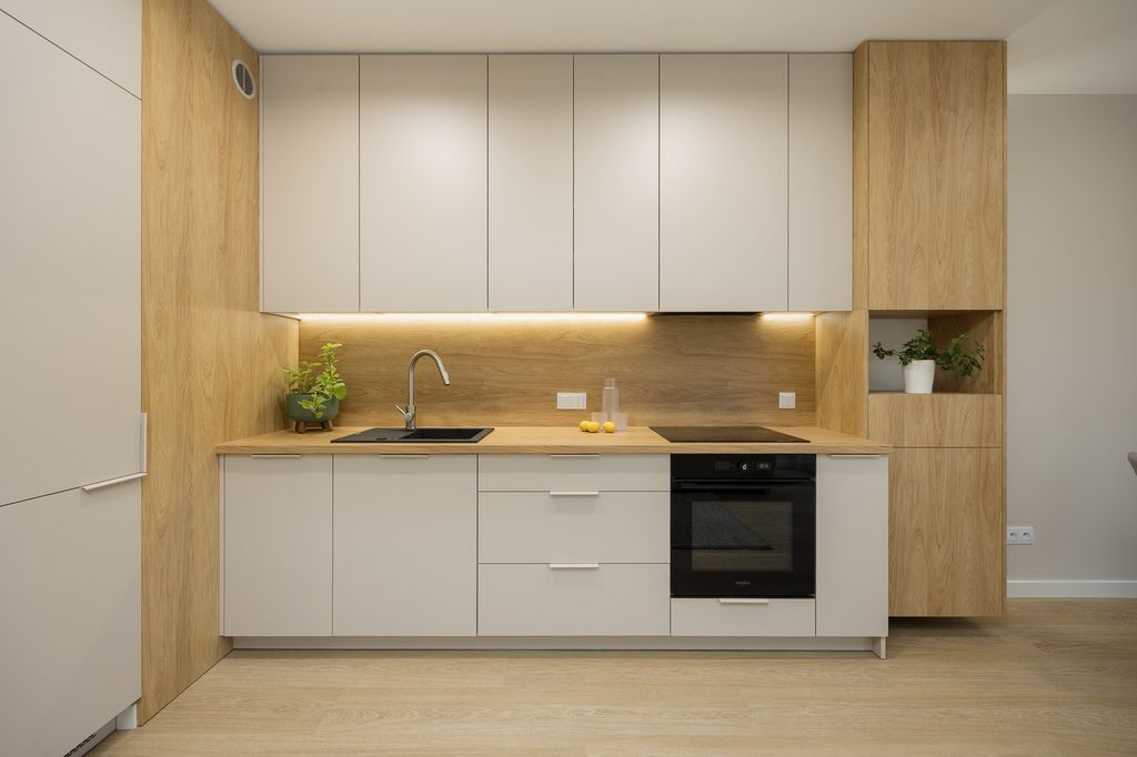 - Przestronny salon z aneksem kuchennym – naturalnie doświetlona część dzienna, z dużymi przeszkleniami i ergonomicznie rozplanowaną kuchnią wykonaną na zamówienie. Aneks wyposażono w kompletny zestaw sprzętów AGD marek Samsung, Bosch i Whirlpool.