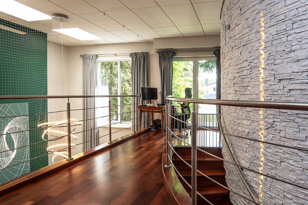 Podłoga jatoba. Drzwi wewnętrzne pełne, fornirowane typ orzech amerykański. Wkład kominkowy, zwykły bez rozprowadzenia. Ściana dylatacyjna jest zrobiona, każdy budynek ma swoja oddzielną ścianę. Kamień na kominku marmur brechia. Ogrzewanie nadmuchowe, nowy Rekuperator WEBER ECO 400 r z 2025 roku., gruntowy wymiennik ciepła, zaciąga zimne powietrze i wymienia, naturalna klimatyzacja, przepuszczone przez warstwy ziemi. Piec gazowy z zasobnikiem. Alarm można uruchomić w podziale na strefy: zewnętrzną i wewnętrzną. Roleta na drzwi wejściowe i drzwi antywłamaniowe. Podlewanie z miejskiej wody, sterowane, skraplacze i sztyce: do roślin i do trawnika.