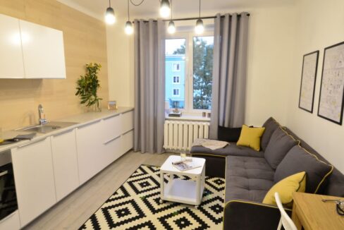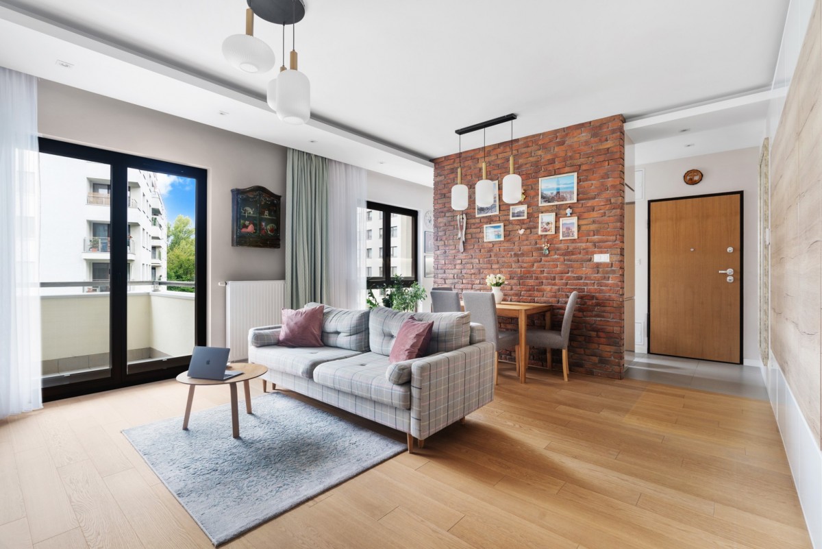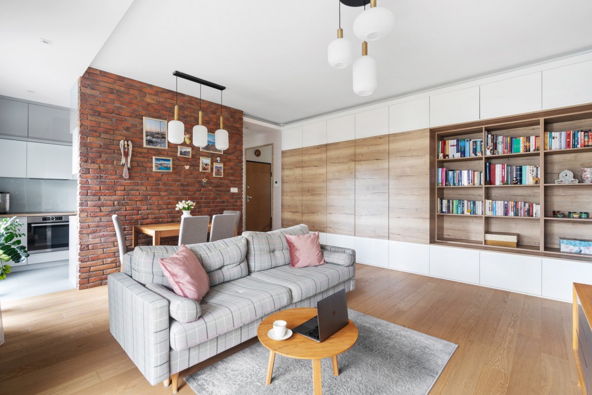 – Salon z aneksem kuchennym (35 m²) – serce mieszkania, przestronne i funkcjonalne, oddzielone od części kuchennej ścianką z cegły – z wyjściem na balkon