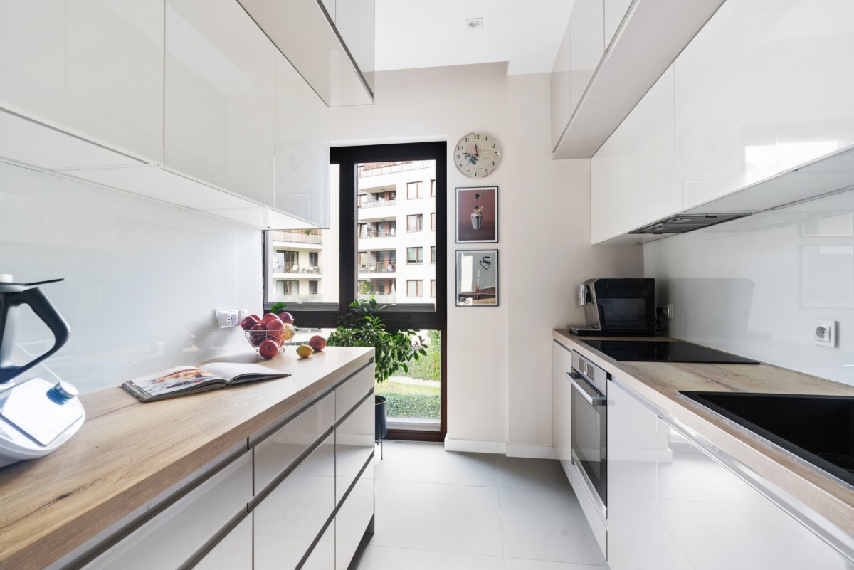 Kuchnia i AGD – zabudowa pod wymiar oraz sprzęty renomowanych marek: BOSCH (piekarnik, płyta, lodówka, zmywarka, pralka), FRANKE (okap i zlew).