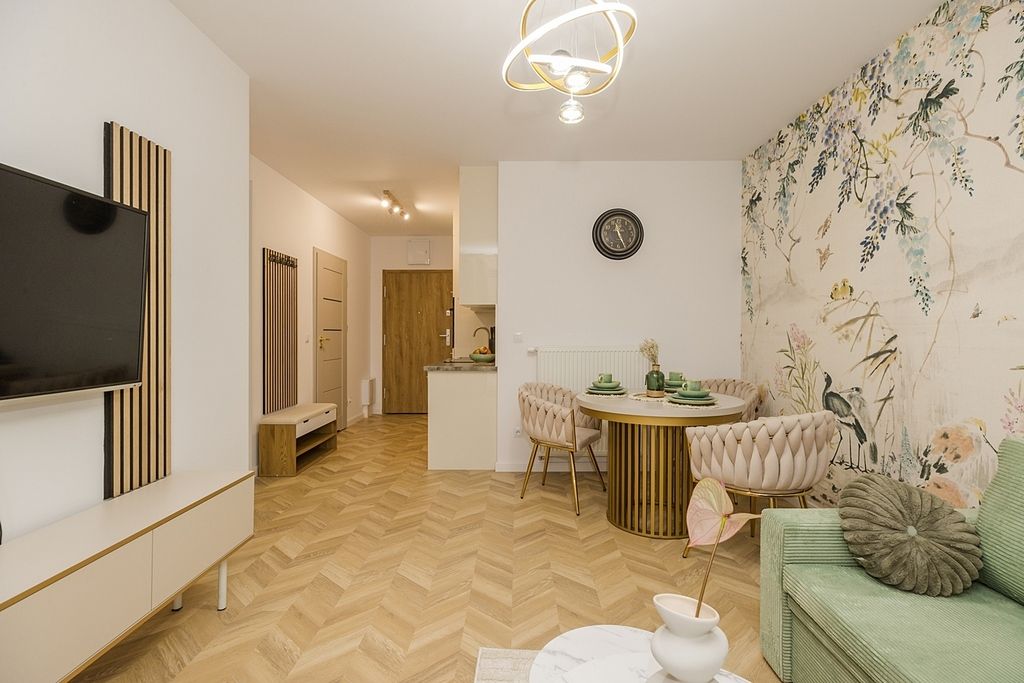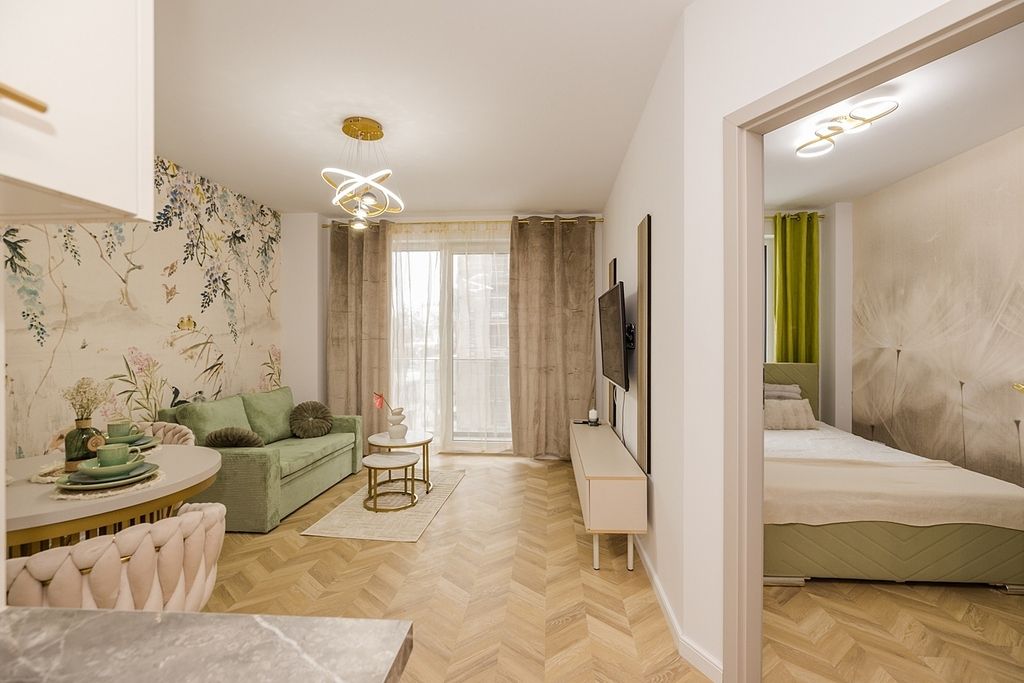 Do wynajęcia zupełnie nowe, nigdy nie zamieszkałe i w pełni umeblowane 2 pokojowe mieszkanie, zlokalizowane na drugim piętrze nowoczesnego budynku.