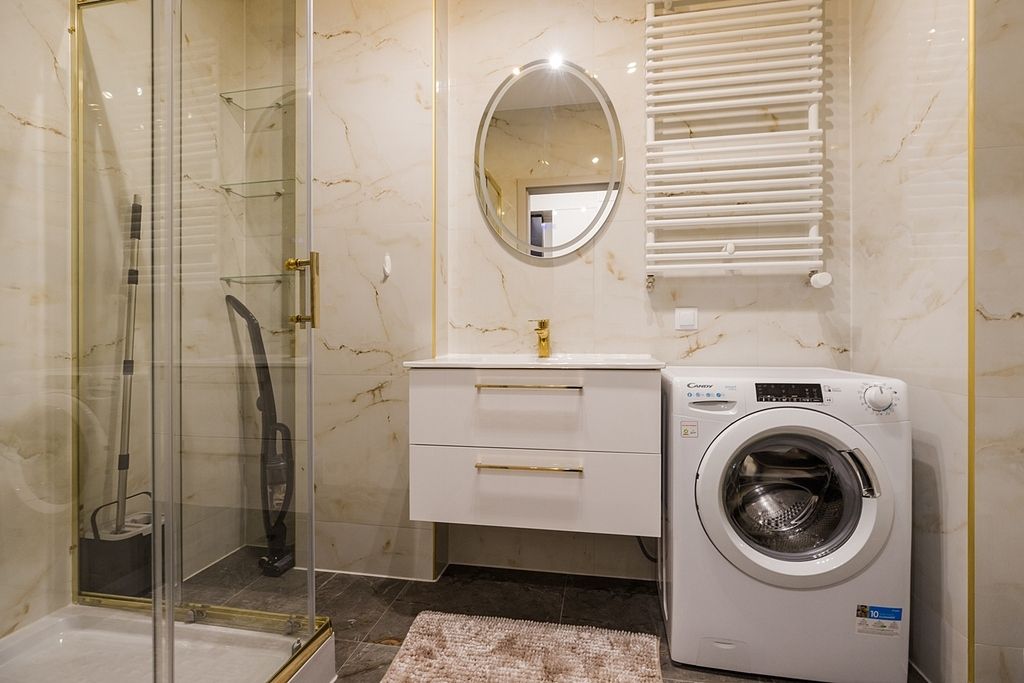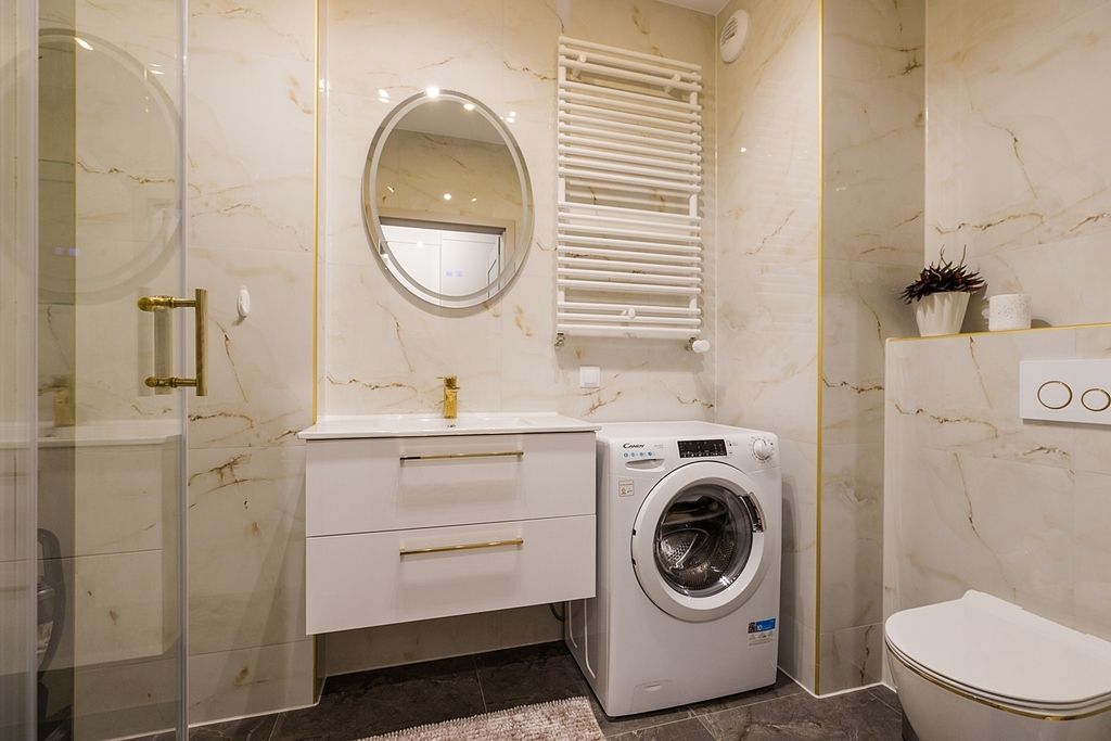 – łazienka z wc, prysznicem, zabudową meblową i pralką,
