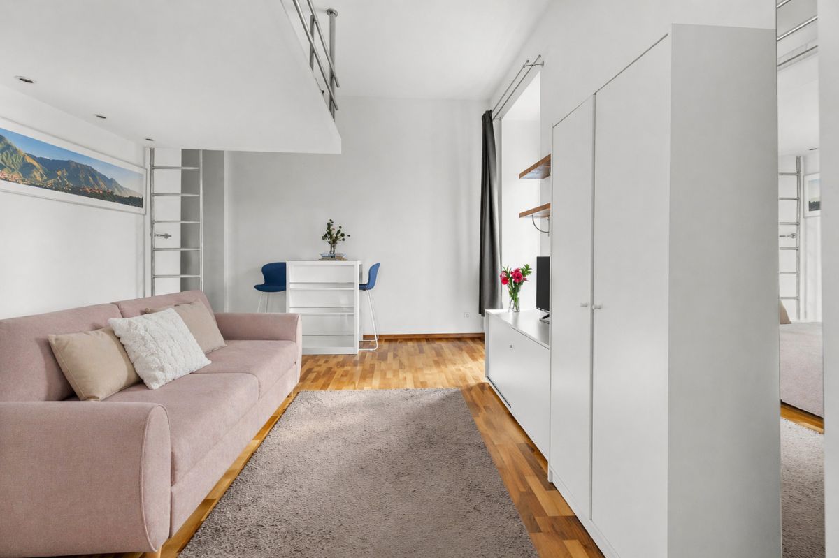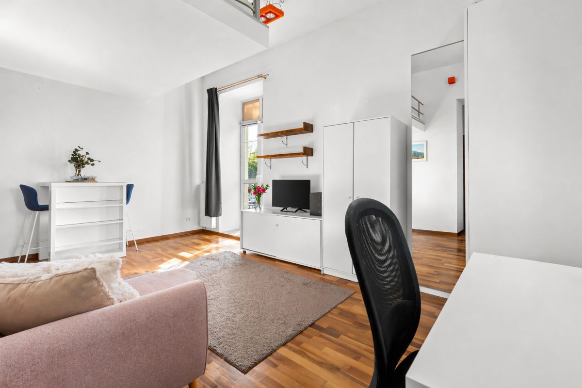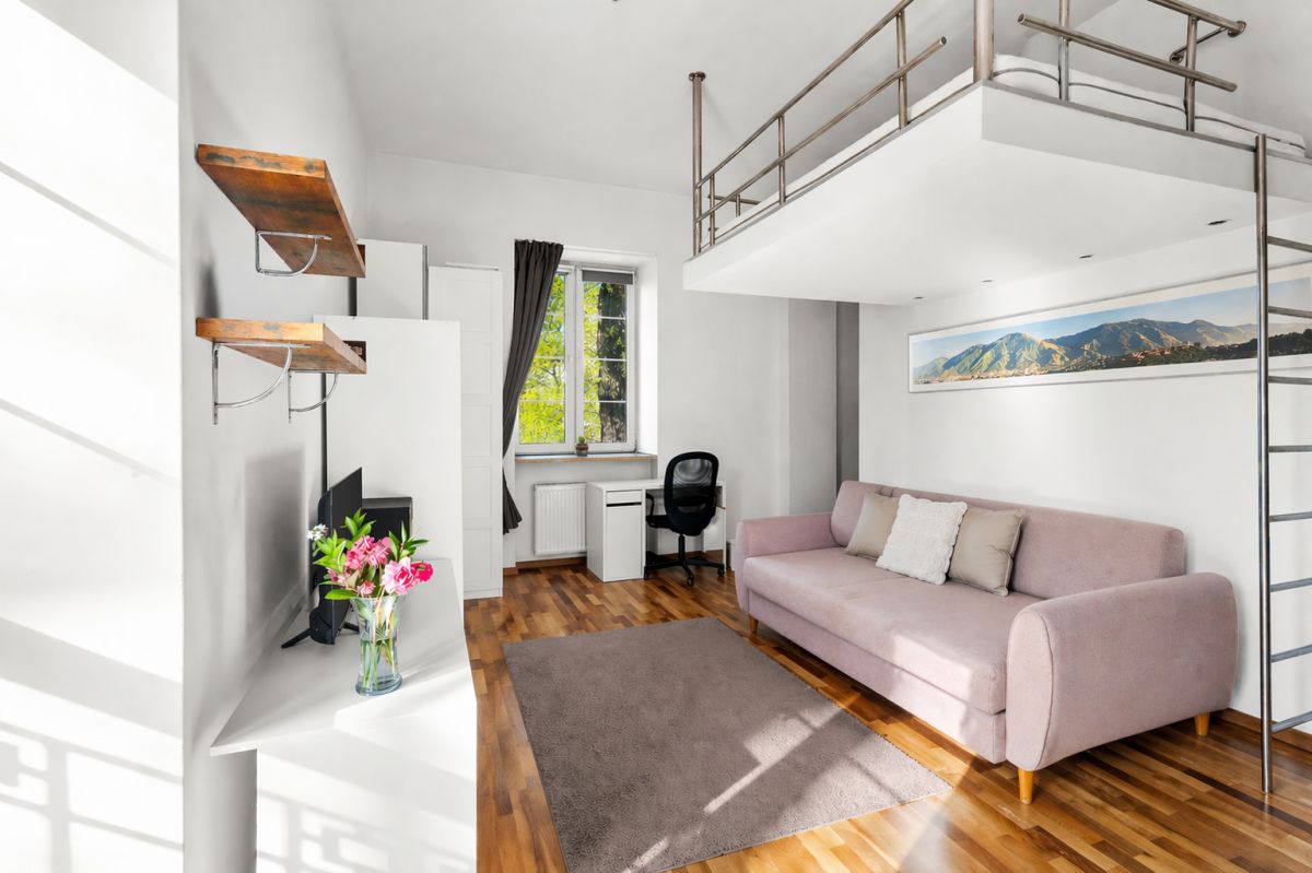Największym atutem nieruchomości jest imponująca wysokość – aż 3,30 m. Dzięki temu powstała wygodna antresola, która pełni funkcję sypialni, zapewniając wyraźne oddzielenie strefy dziennej od nocnej. To rozwiązanie znacząco podnosi komfort codziennego życia. Dodatkowo na antresoli znajduje się gniazdko elektryczne, co umożliwia swobodne korzystanie z oświetlenia oraz ładowanie urządzeń.