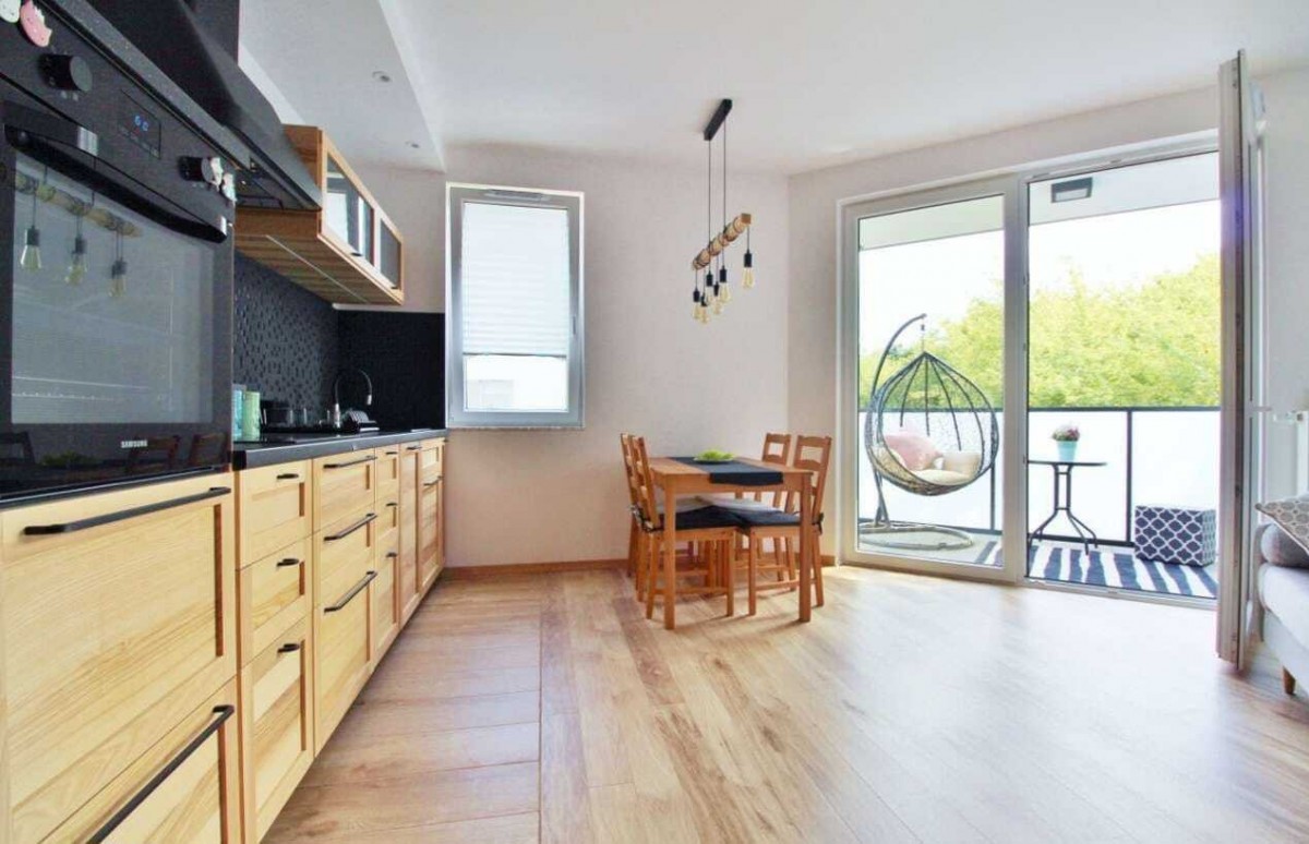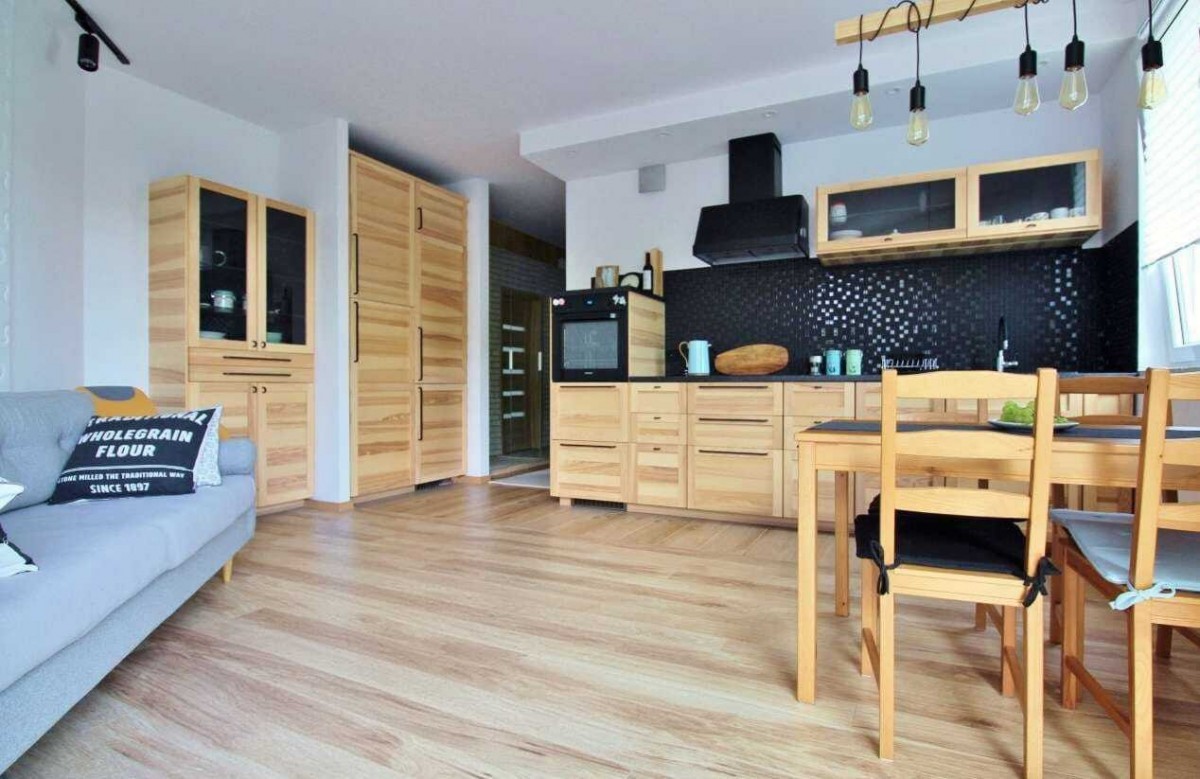 Kuchnia w formie aneksu z zabudową meblową z drewnianym fornirem, wyposażona we wszystkie niezbędne sprzęty AGD (piekarnik, zmywarka).