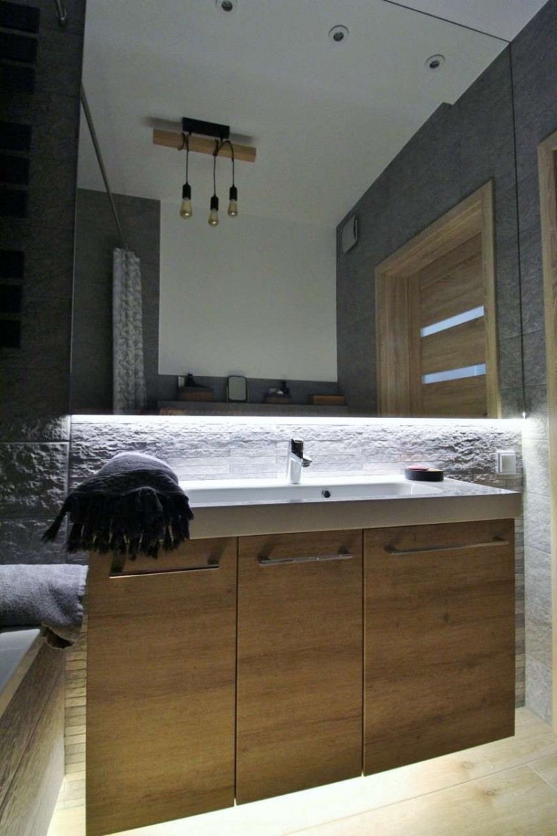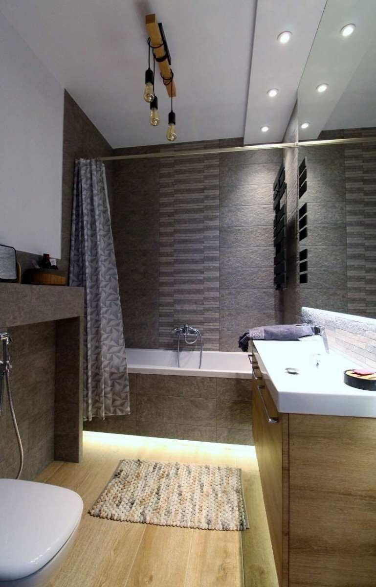 Łazienka urządzona w kolorach ziemi, z wanną i prysznicem w jednym. Wygodna umywalka z dużym lustrem oraz dodatkowe oświetlenie tworzą przyjemną atmosferę podczas kąpieli.