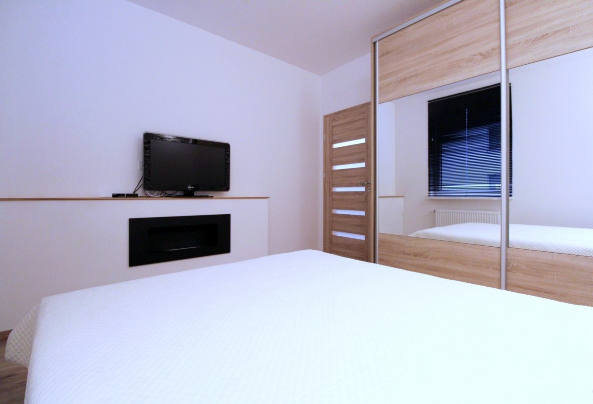 Na końcu mieszkania znajduje się główna sypialna z dużą szafą, łóżkiem, a także bio-kominkiem i TV – idealna strefa relaksu.