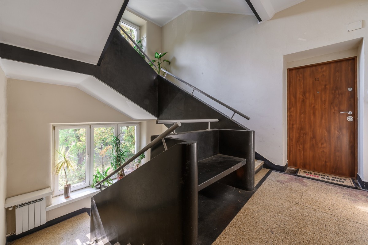 Mieszkanie znajduje się na 2. piętrze w kameralnej, trzypiętrowej kamienicy z 1936 roku. Budynek jest w dobrym stanie technicznym – wymieniono piony wodno-kanalizacyjne, instalację elektryczną, a klatka schodowa została wyremontowana z dbałością o historyczne detale.