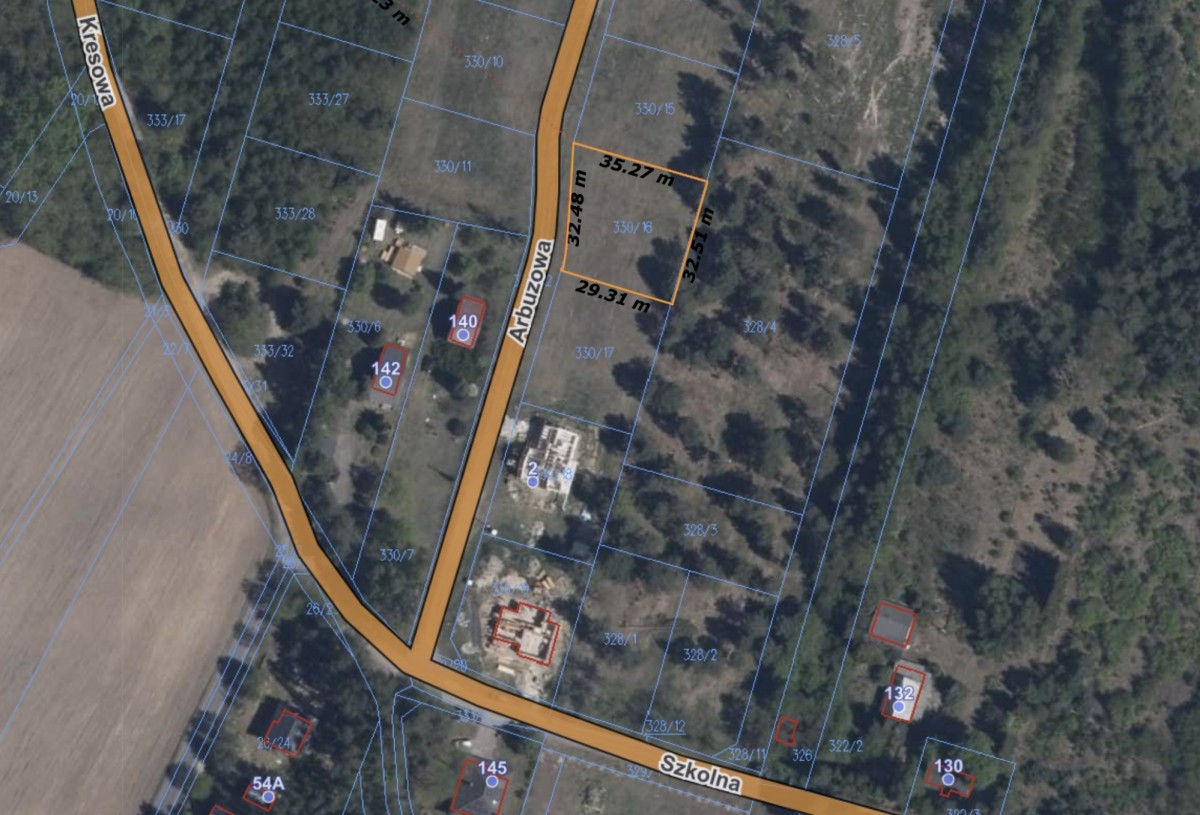 Nr ewidencyjny działki 330/16. Adres: ul. Arbuzowa 6. Na wysokości adresu ul. Szkolna 138. Blisko miejscowości Wężyk. Wszystkie dokumenty dostępne do wglądu.