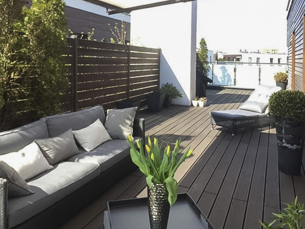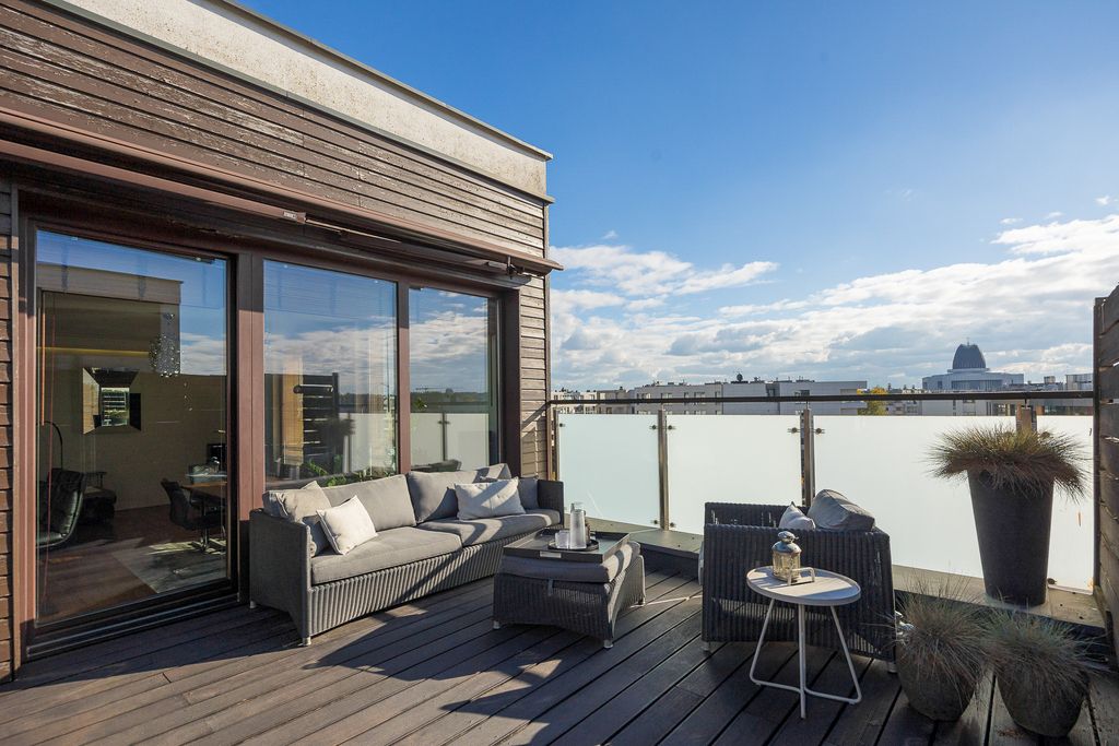 The 55 m² terrace offers privacy, peace, and open views – equipped with lighting and an automatic awning, it perfectly extends the living space outdoors.