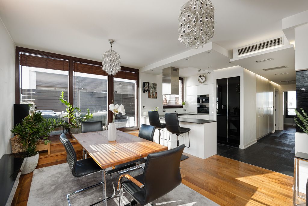 Luksusowy apartament z dużym tarasem położony na ostatnim, czwartym piętrze budynku z 2009 roku przy Alei Rzeczypospolitej 18, w inwestycji Scandinavian House na terenie Miasteczka Wilanów.