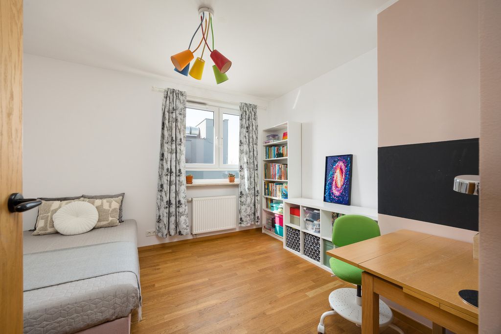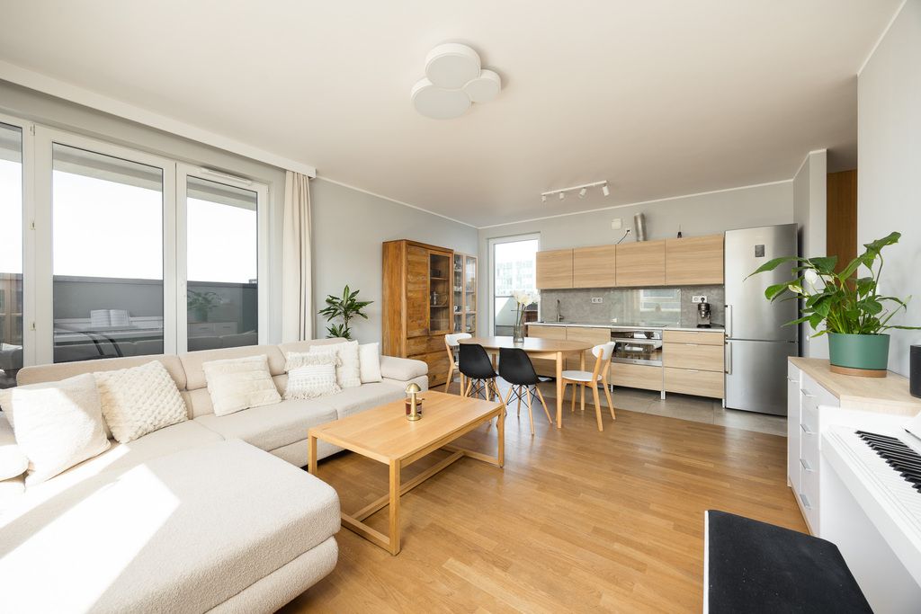 Mieszkanie znajduje się na ostatnim piętrze budynku, co zapewnia poczucie prywatności, brak sąsiadów nad lokalem oraz bardzo atrakcyjny widok na okolicę. Lokal jest trójstronny, z ekspozycją okien na wschód, zachód i południe, dzięki czemu wnętrza są bardzo dobrze doświetlone. Układ pomieszczeń jest bardzo funkcjonalny i pozwala na wygodne wydzielenie części dziennej oraz prywatnej.