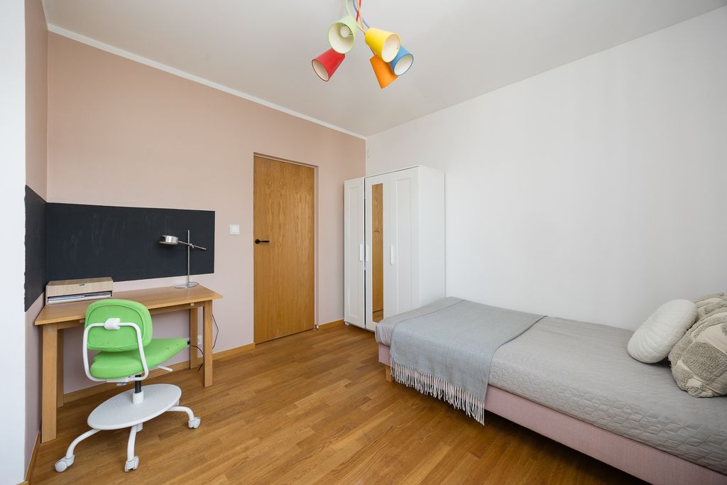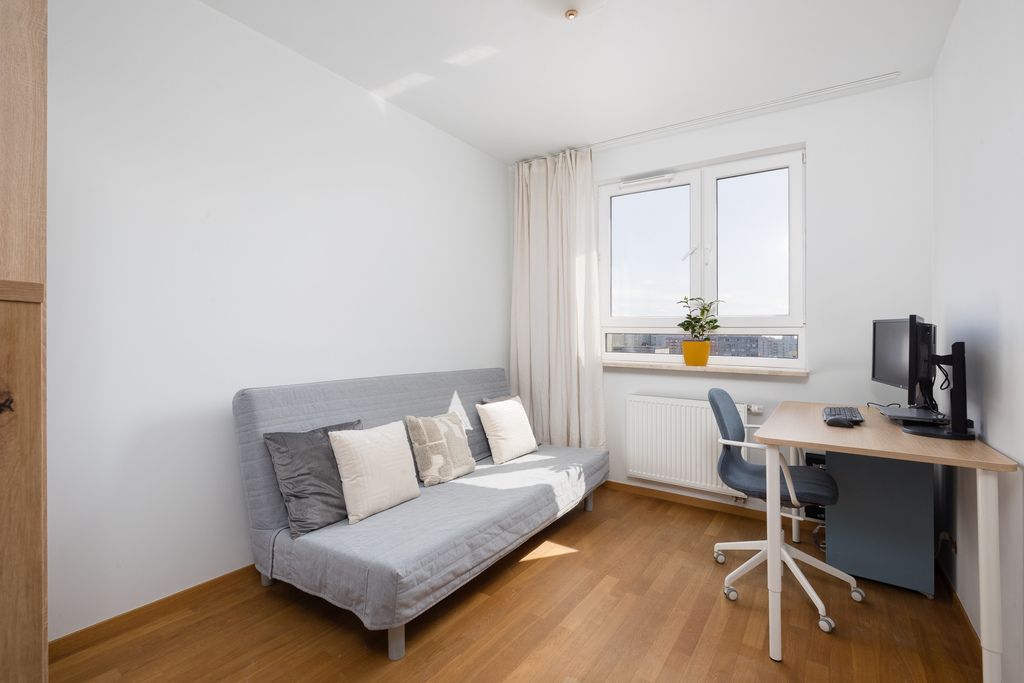 Czteropokojowe mieszkanie z tarasem na warszawskim Mokotowie położone na dziewiątym (ostatnim) piętrze budynku z 2016 roku przy ul. Cybernetyki 2B.