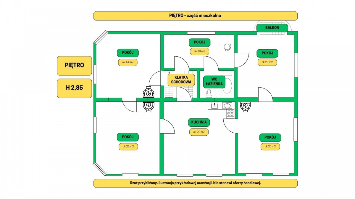 wysokość pomieszczeń w domu głównym (cz. usługowa 3m, cz. mieszkaniowa 2,85m)