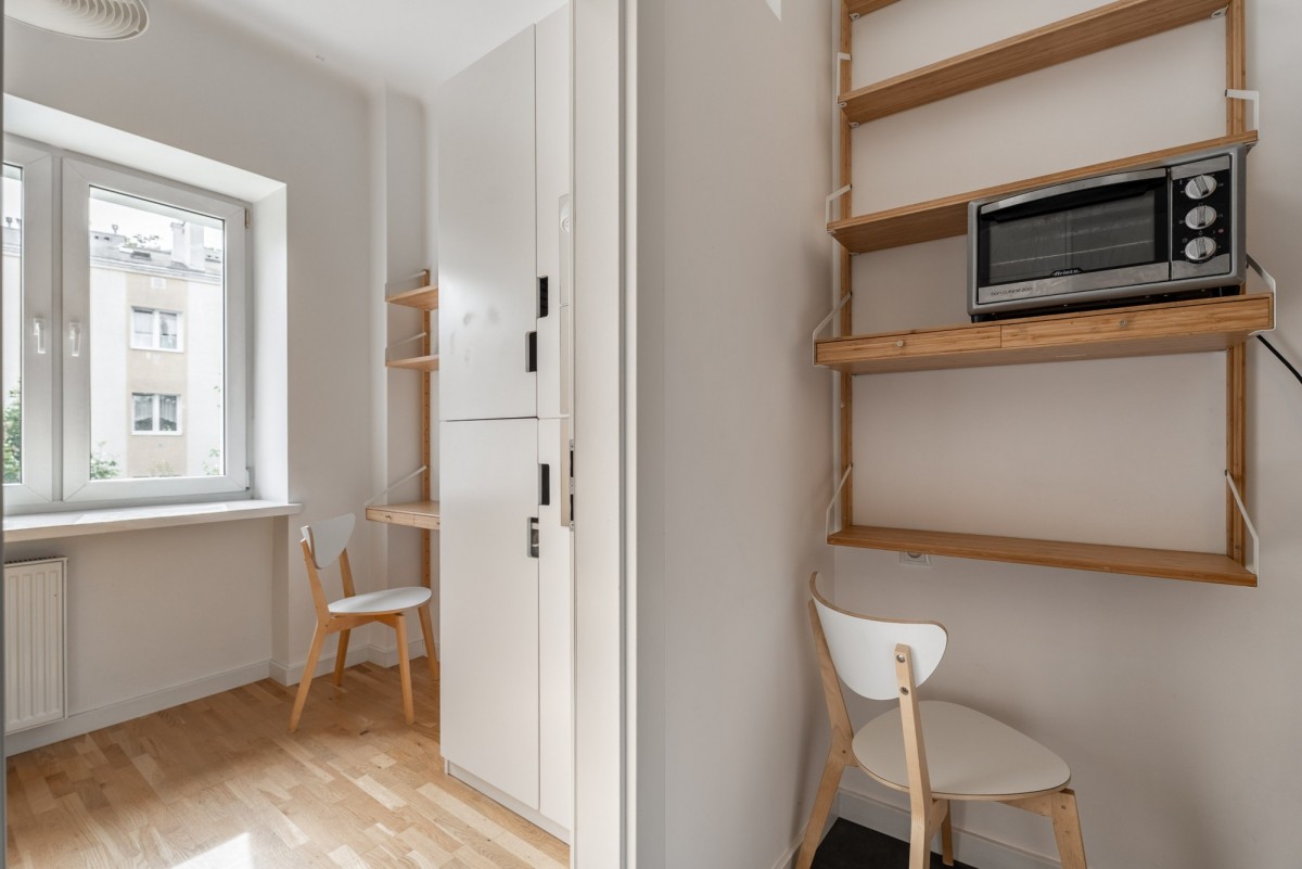 Mieszkanie o powierzchni 31,11 m² położone na 1. piętrze czteropiętrowego budynku. Wysokość pomieszczeń wynosi 290 cm, co dodatkowo potęguje wrażenie przestronności.