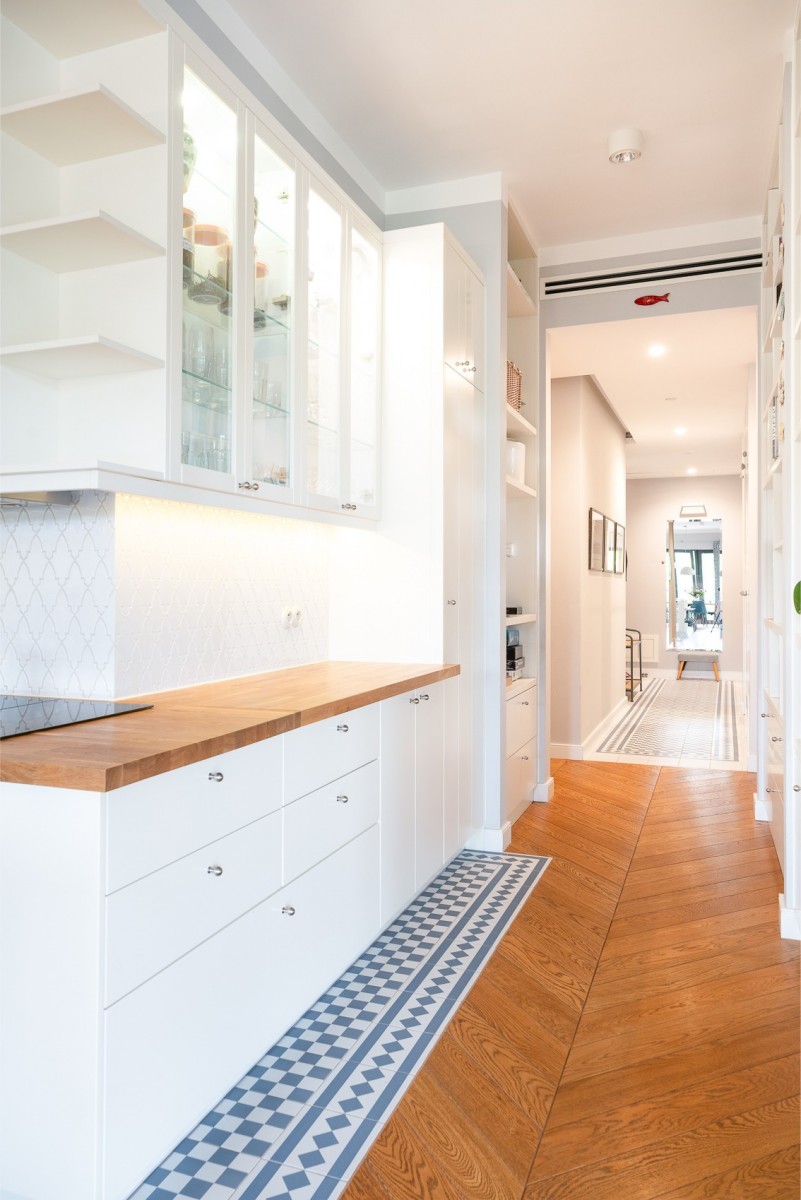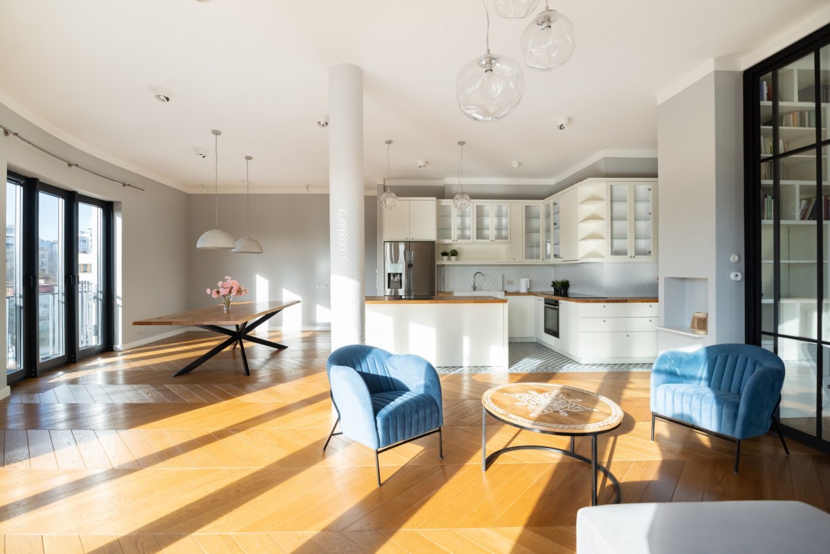Na podłogach dębowe deski, zabudowy wykonane na wymiar, designerskie meble, wysokiej klasy AGD, klimatyzacja i rolety. Wysokość pomieszczeń: 3,40 m.