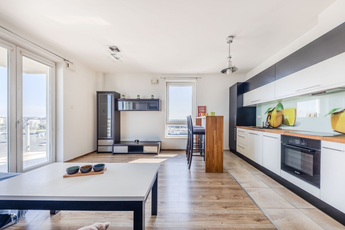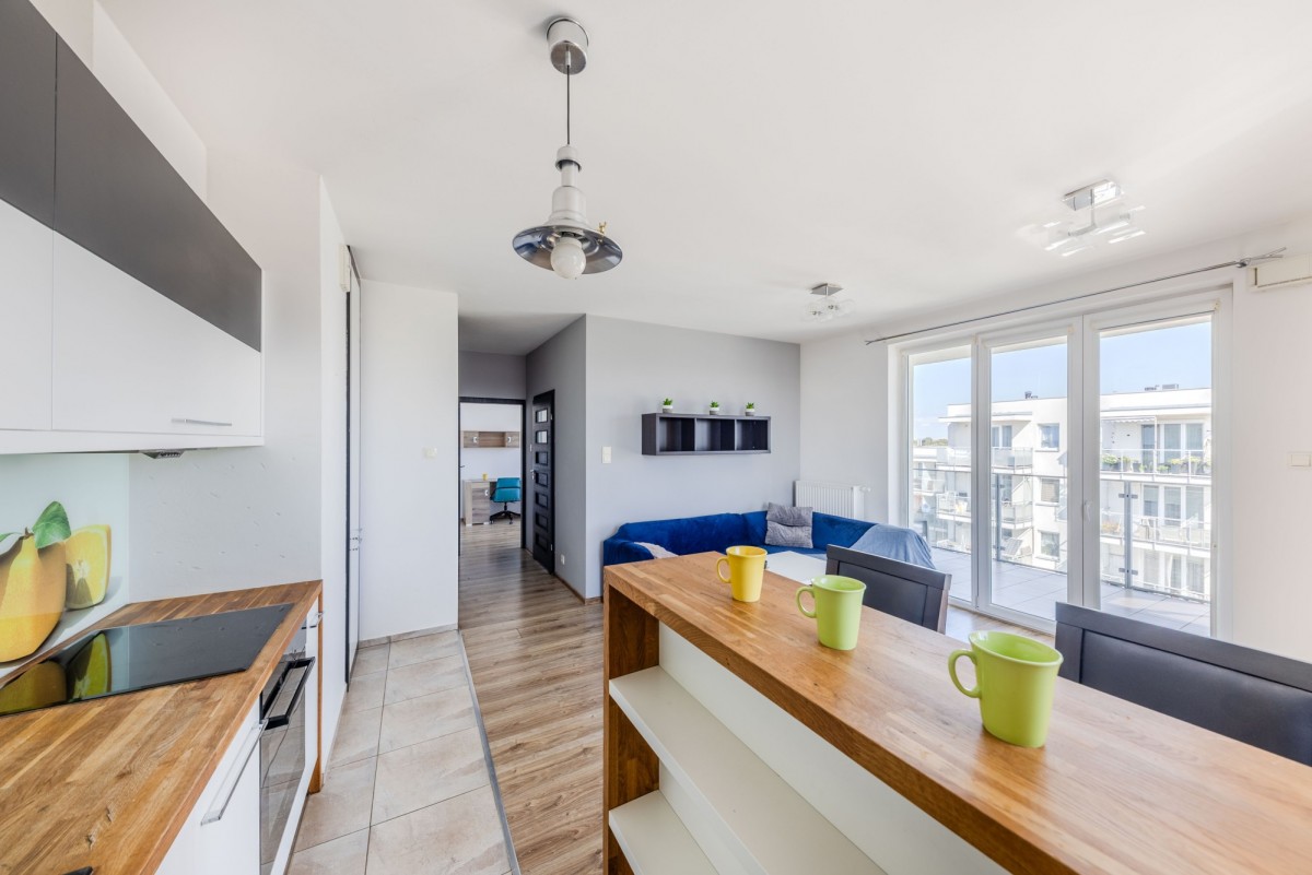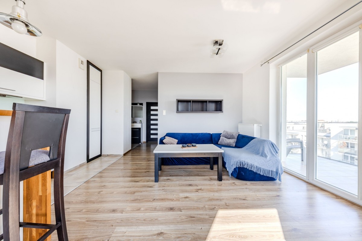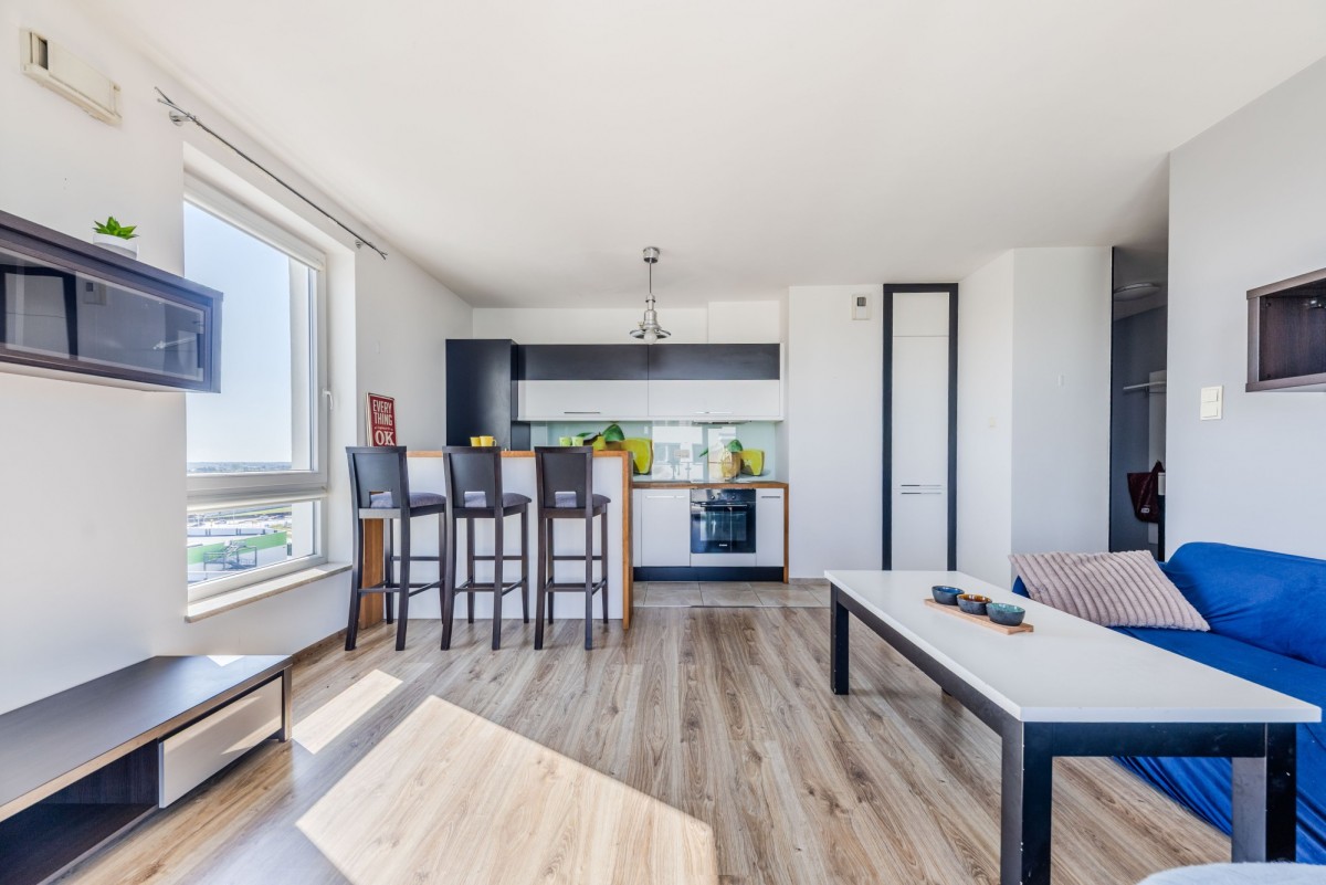 W blisko 25 m2 salonie z aneksem kuchennym znajduje się; sofa, stolik kawowy, barek z wysokimi krzesłami.
