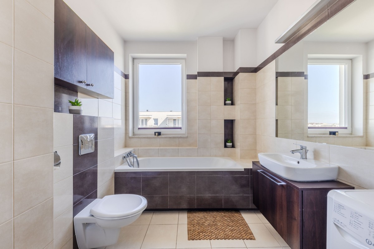 Łazienka prawie 5 m2 z dużym oknem wpuszczającym dzienne światło, w pełni wyposażona wraz z pralką.