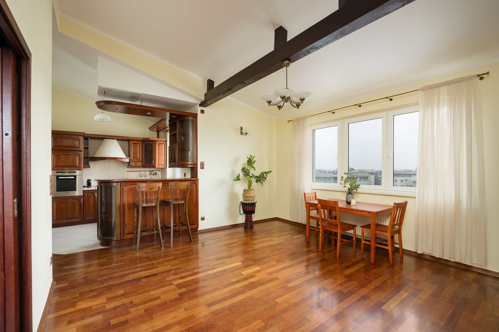 Apartament znajduje się na ostatnim piętrze kameralnego budynku, na zamkniętym osiedlu z miejscem parkingowym w garażu podziemnym. W najwyższym punkcie mieszkanie ma aż 3,8 m wysokości, co zapewnia niezwykłe poczucie przestrzeni i światła. Z okien rozpościera się piękny widok na centrum miasta oraz spektakularne wschody słońca.