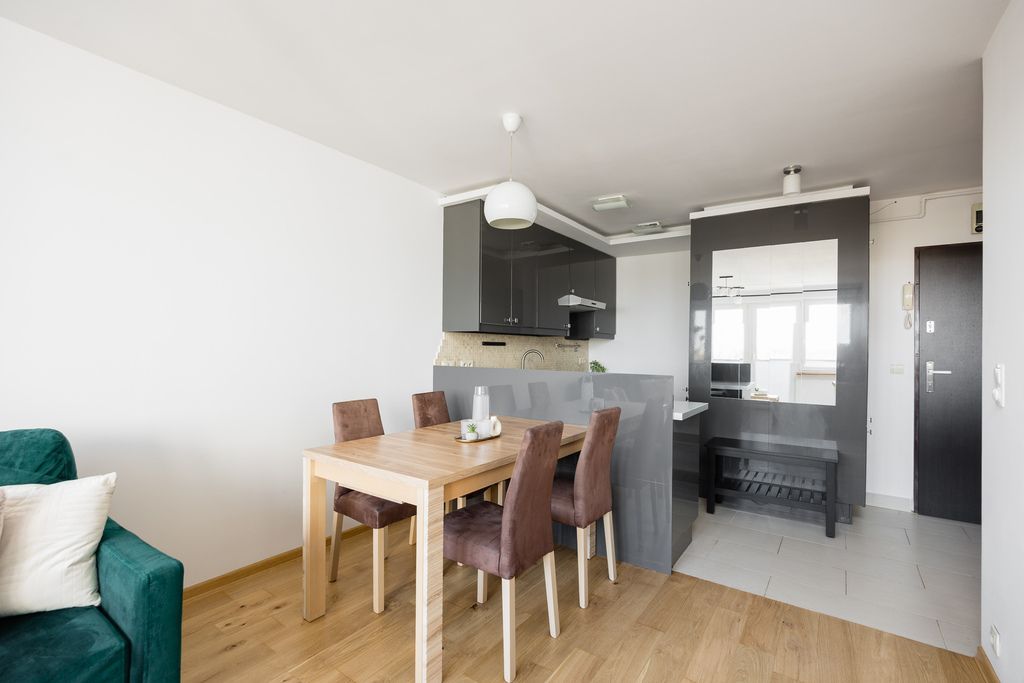 Mieszkanie jest jasne, dobrze doświetlone i posiada wschodnią ekspozycję okien. Dużym atutem jest balkon oraz piękny widok na Wisłę.