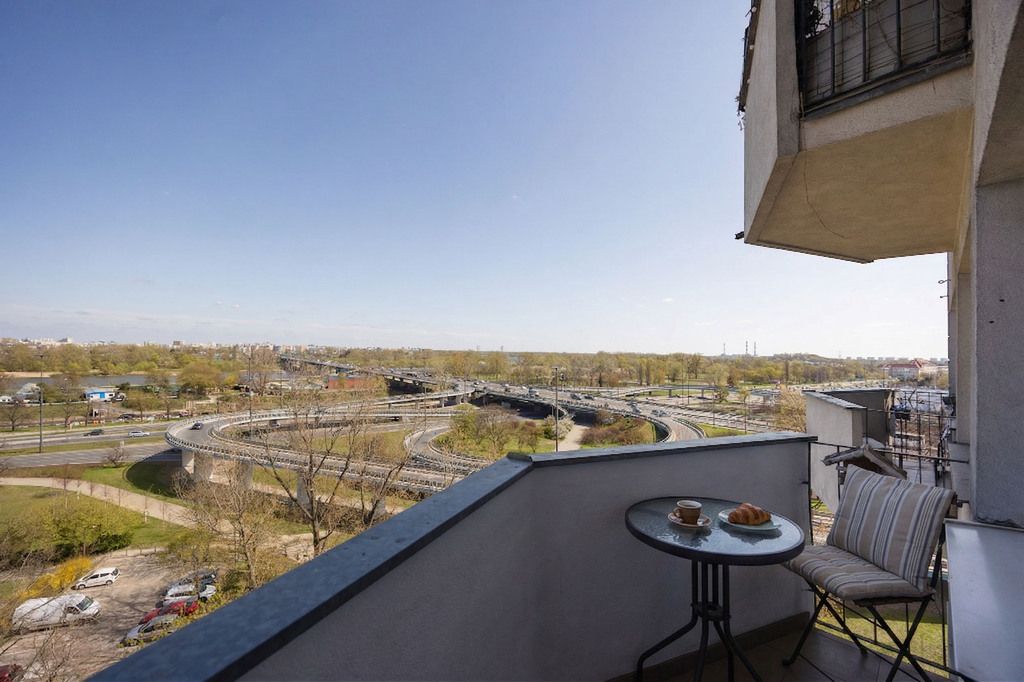 Gotowe do zamieszkania, dwupokojowe mieszkanie z balkonem i widokiem na Wisłę, położone na dziewiątym piętrze szesnastopiętrowego budynku z windą z 1968 roku, zlokalizowane na warszawskim Powiślu przy ul. Fabrycznej 2.