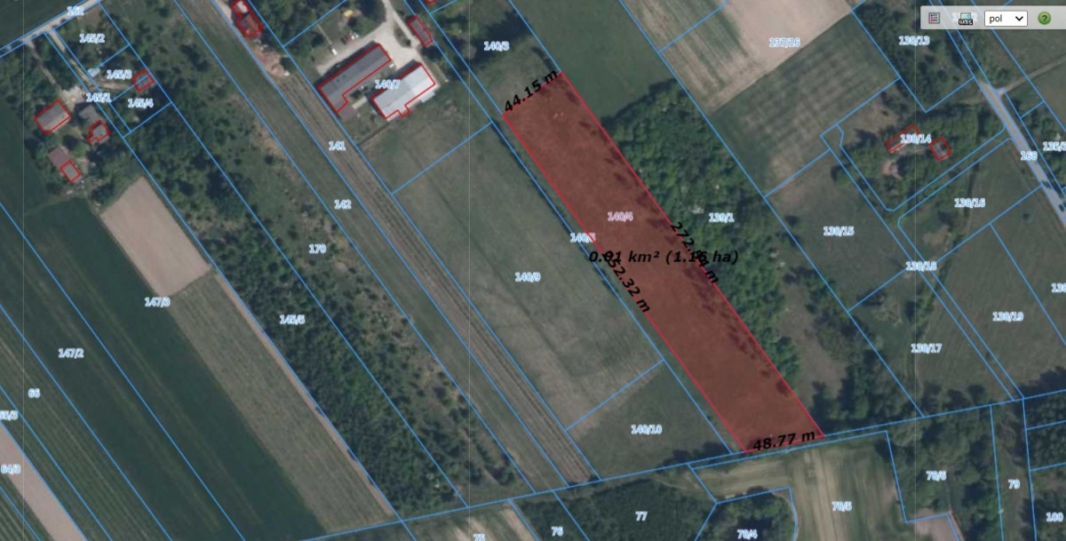 Działka w kształcie zbliżonym do prostokąta o wymiarach: szerokość 44,3m, długość 252 do 272 m.