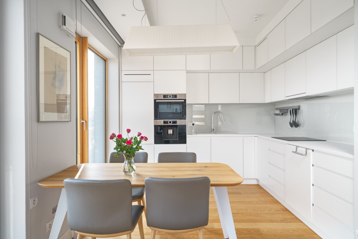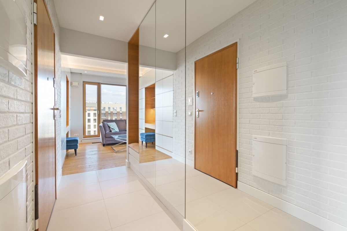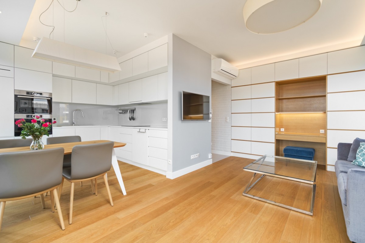 Mieszkanie zostało wykończone w podwyższonym standardzie. Jest w pełni umeblowane i wyposażone, z eleganckimi zabudowami stolarskimi wykonanymi na wymiar.