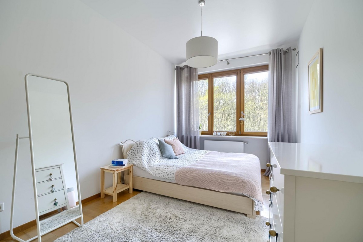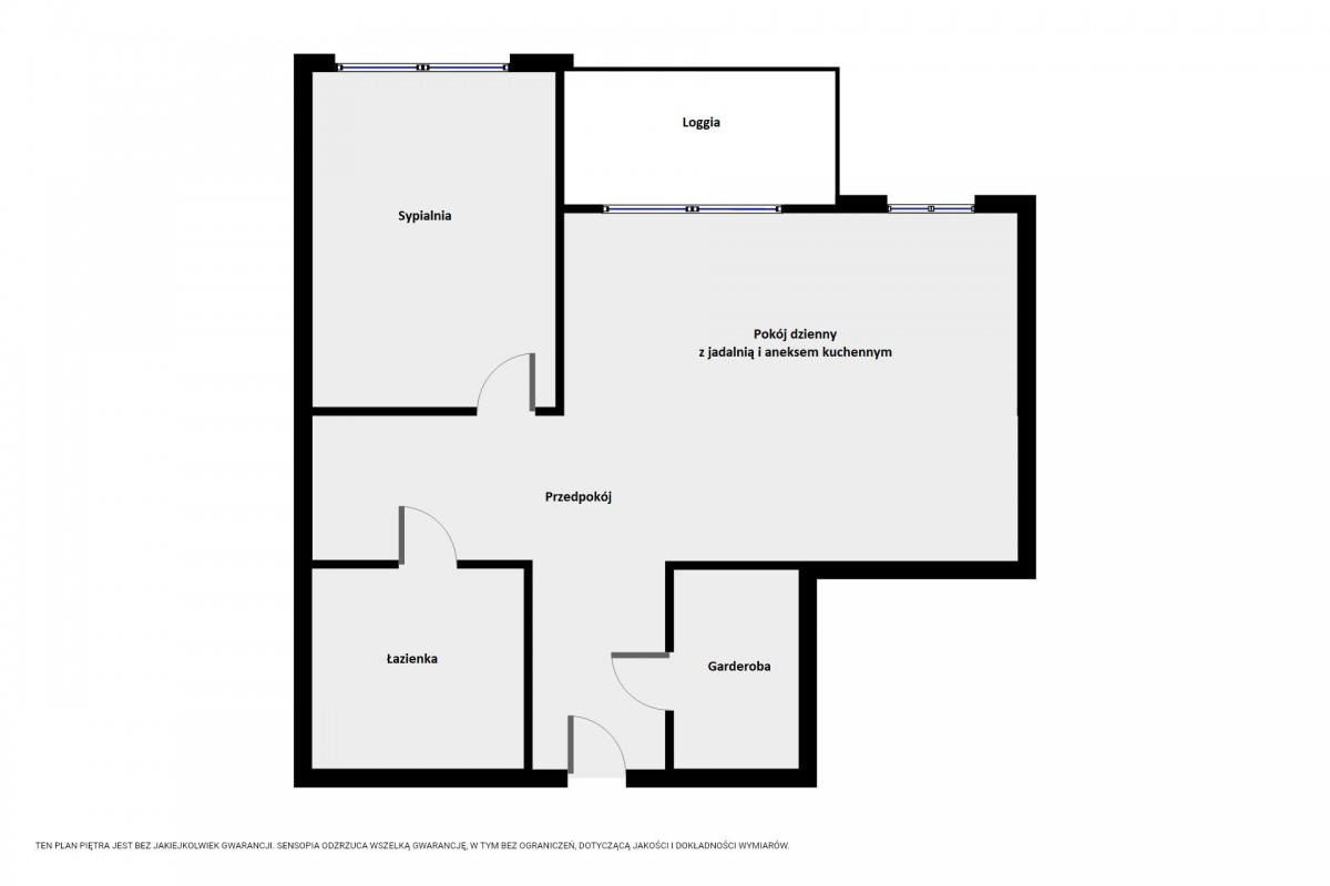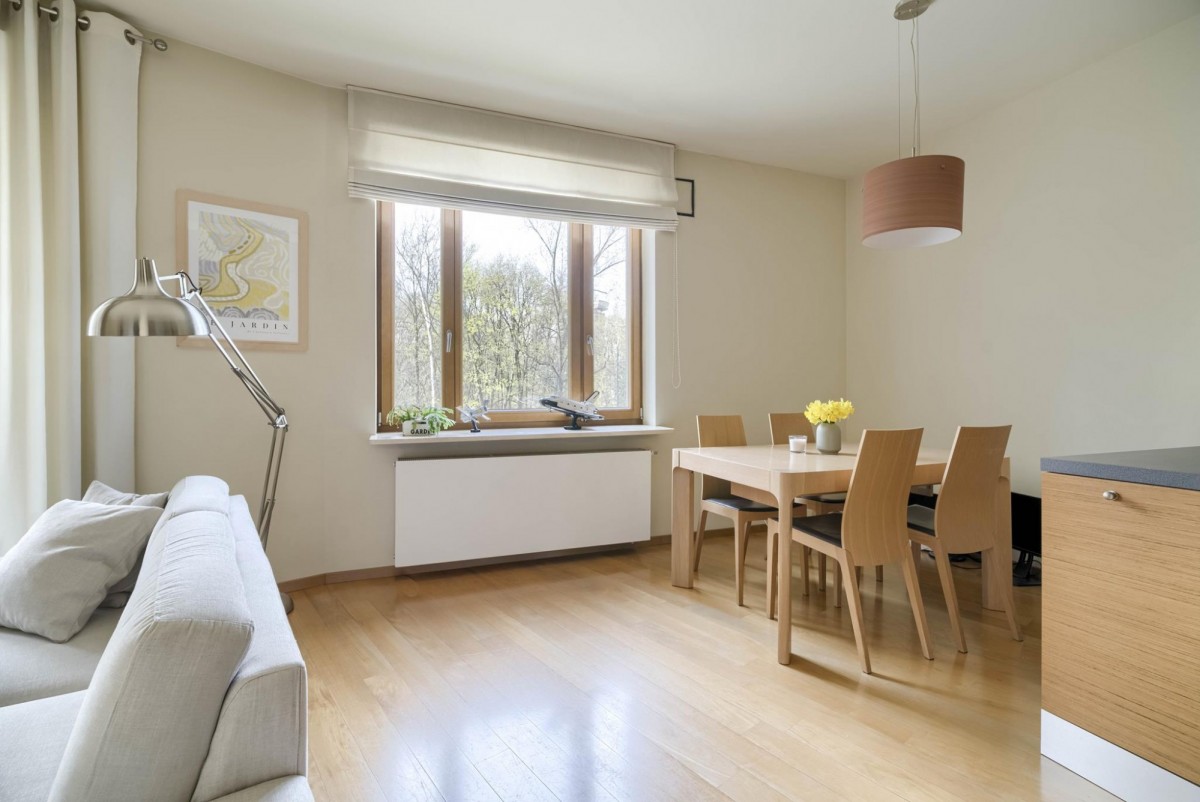 Pokój dzienny podzielony na dwie strefy: wypoczynkową oraz jadalnię. Duża loggia z widokiem na zieleń. Aneks kuchenny w pełni wyposażony w sprzęt AGD.