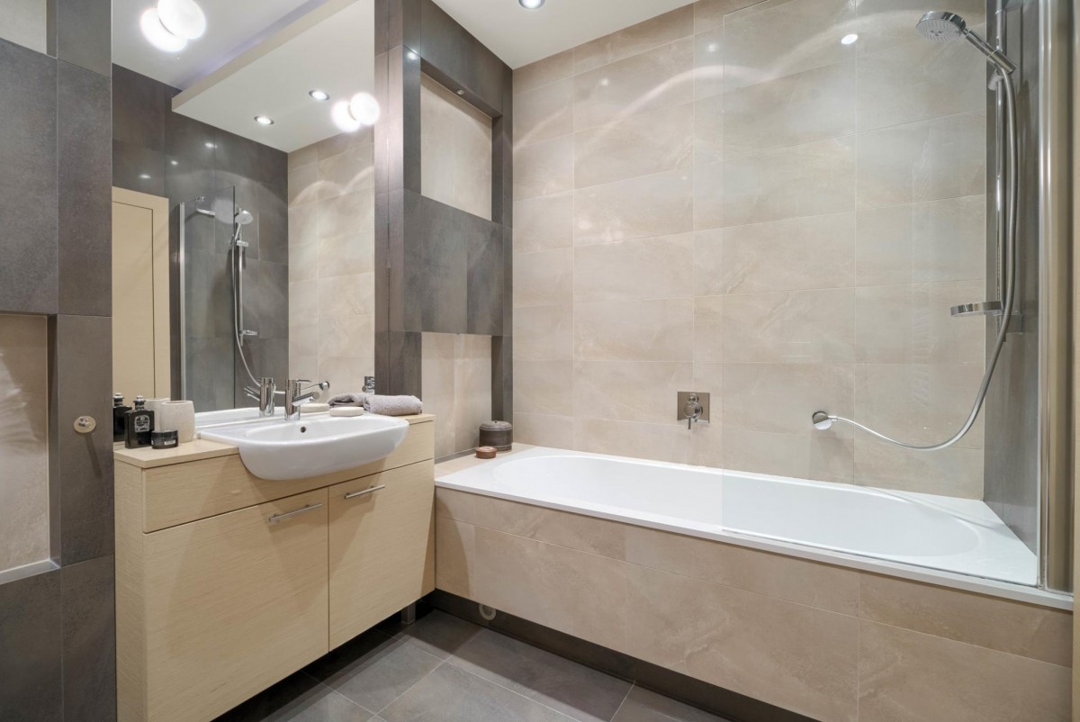 W łazience wanna z możliwością korzystania jak z prysznica, WC, umywalka, pralka w zabudowie i dużo miejsca do przechowywania.