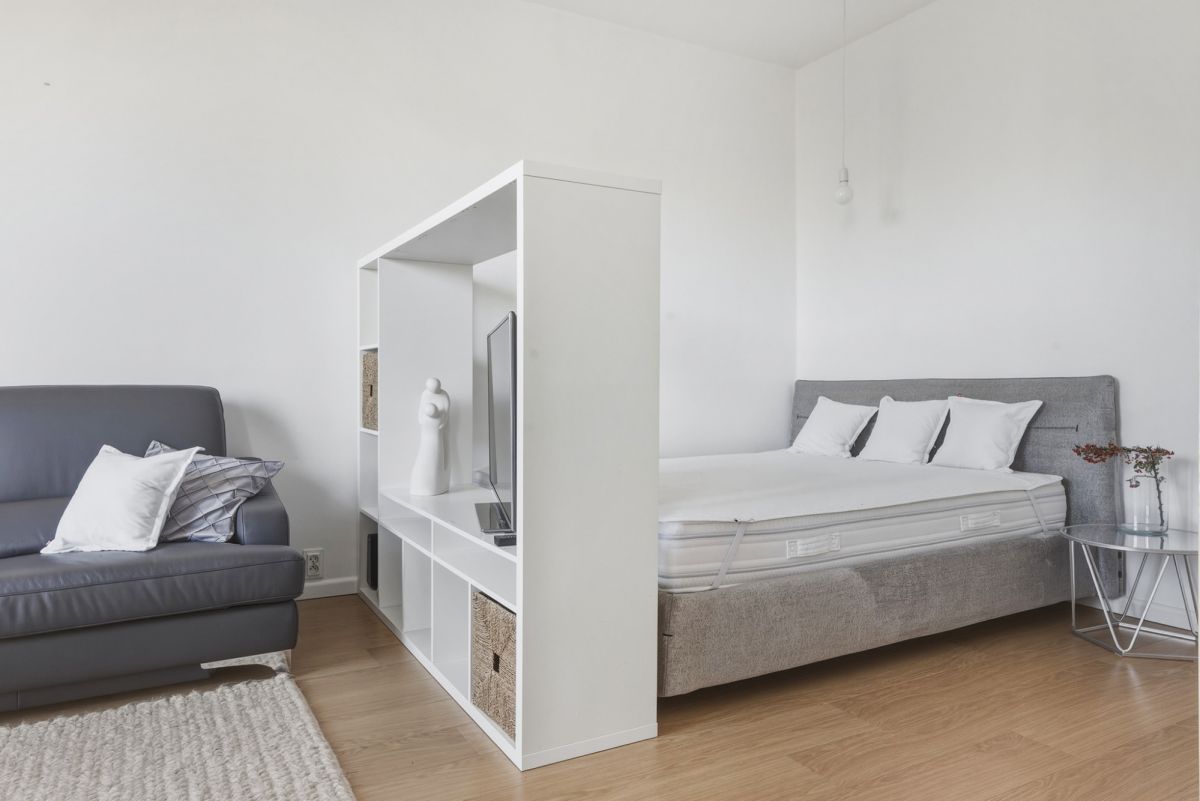 • Wydzielona część sypialniana oddzielona regałem z otwartymi półkami